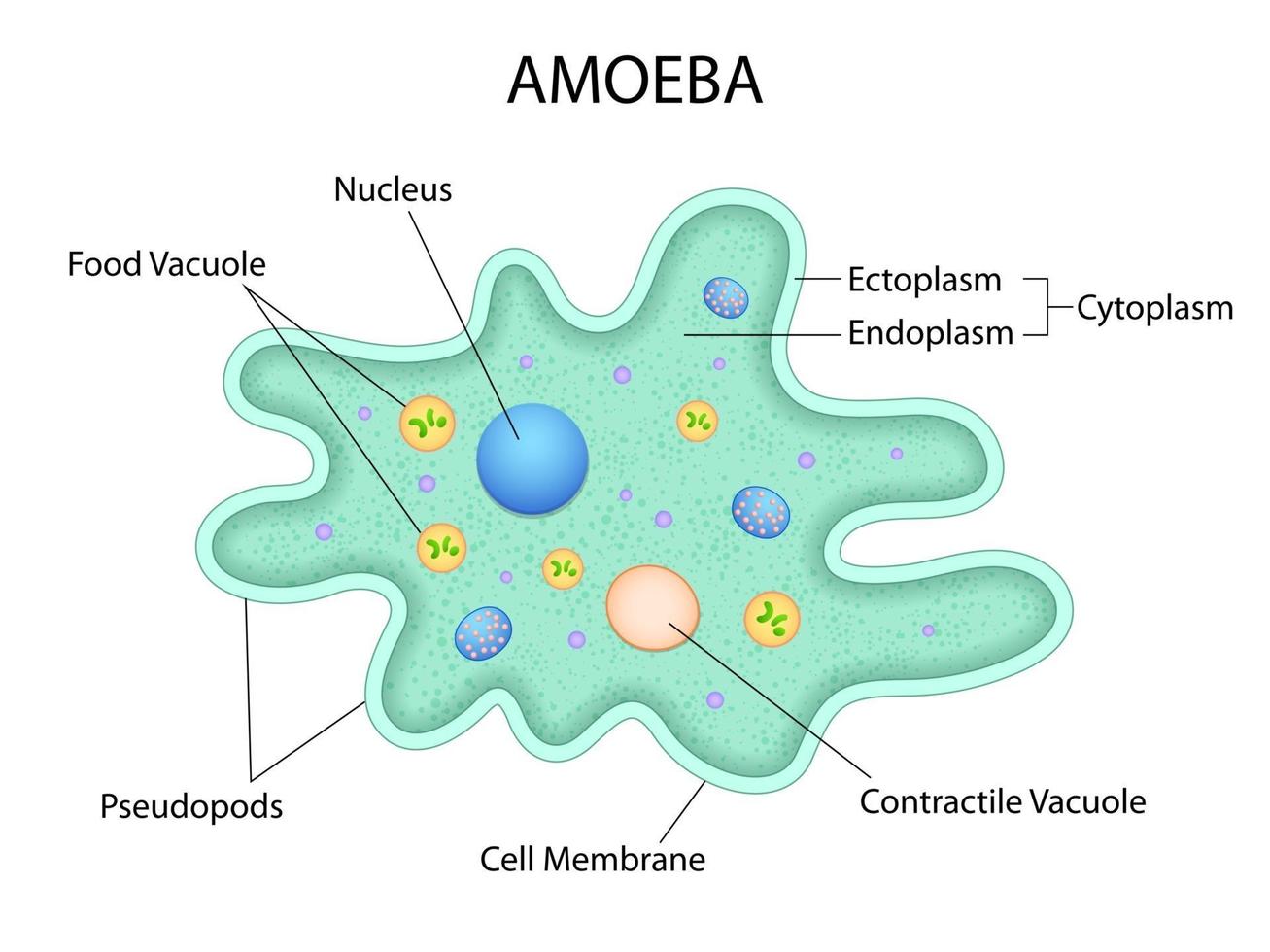 An amoeba is a unicellular, shapeless, and colorless microorganism composed of a jelly-like structure capable of continually changing shape due to its flexible cell membrane and cytoplasm.​ Structure and Organelles The main parts are the plasma membrane, cytoplasm (differentiated into outer ectoplasm and inner endoplasm), and a centrally located nucleus that controls all functions and contains genetic material.​ Amoeba possess pseudopodia (“false feet”), which are finger-like cytoplasmic extensions used for movement and engulfing food particles by phagocytosis.​ Other organelles include food vacuoles (where ingested food is stored and digested), contractile vacuoles (regulate water balance/osmoregulation), mitochondria, Golgi apparatus, and fat globules.​ Function and Adaptation Amoeba moves by extending and retracting its pseudopodia, allowing rapid changes in shape and locomotion—this is termed “amoeboid movement”.​ It feeds using phagocytosis (engulfing solid food) and pinocytosis (absorbing liquids), digesting particles inside food vacuoles.​ Reproduction is asexual, typically by binary fission, producing identical daughter cells; under harsh conditions, amoeba form protective cysts and 'reawaken' when conditions improve.​ Although its lifespan is just a few days, binary fission essentially makes the lineage immortal.