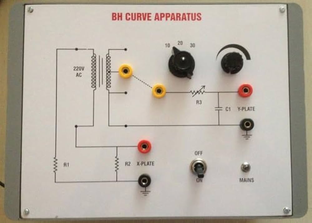 Solenoid Structure: The apparatus features a long solenoid coil designed to create a uniform magnetic field when current is passed through it. Sample Placement: A ferromagnetic specimen (such as an iron rod) is placed inside the solenoid for testing its magnetic properties. Measurement: The system typically includes a reversible key, ammeter for current measurement, and a magnetometer or CRO (Cathode Ray Oscilloscope) to detect and measure the magnetic flux density ( B B) and magnetic field strength ( H H). Operation: Current through the solenoid can be varied, reversing as needed, and the induced magnetic field in the specimen is measured. The procedure involves increasing and decreasing the current systematically to obtain a plot of B B vs H H, demonstrating the magnetic hysteresis loop. Graphical Plotting: The resulting data on B B (magnetic flux density) versus H H (magnetic field strength) is plotted, showing important magnetic properties like retentivity and coercivity. This apparatus is pivotal in studying the hysteresis behavior and magnetic memory of ferromagnetic materials, often used in physics and electrical engineering laboratories for practical demonstration of core concepts.