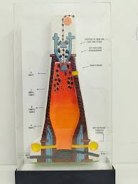 A Blast Furnace Model in showcase is a detailed educational display replicating the structure and process of an industrial blast furnace, typically presented on a base and protected within a transparent case for demonstration and exhibition.​ Description of a Blast Furnace Model in Showcase The model illustrates the tall, vertical shaft design of the blast furnace, clearly showing internal zones (stack, barrel, bosh, hearth) with labeled sections for visual teaching.​ Charging system at the top: Represents raw material input—iron ore, coke, and limestone, added in alternating layers.​ Tuyeres near the base: Depict the hot blast of air injection points for combustion, an essential part of furnace operation.​ Internal zones: Stack: The upper region where materials are pre-heated by rising gases. Bosh: The hottest middle section, where reduction reactions occur. Hearth: The bottom-most part, collecting molten iron and slag.​ Taphole and slag hole: Shown at the base for removal of molten iron and slag, demonstrating product extraction.​ The base serves for stability and labeling, while the transparent showcase shields the model, making it accessible for classroom, laboratory, and museum displays.​ Advanced models may include color coding, working lights, moving components, or simplified ‘cutaway’ views to better explain process flow, reactions, and material movement.​ Blast furnace models in showcases are vital for teaching metallurgy, chemical engineering, and industrial processes related to iron and steel production, enabling clear observation of furnace operation and structure.