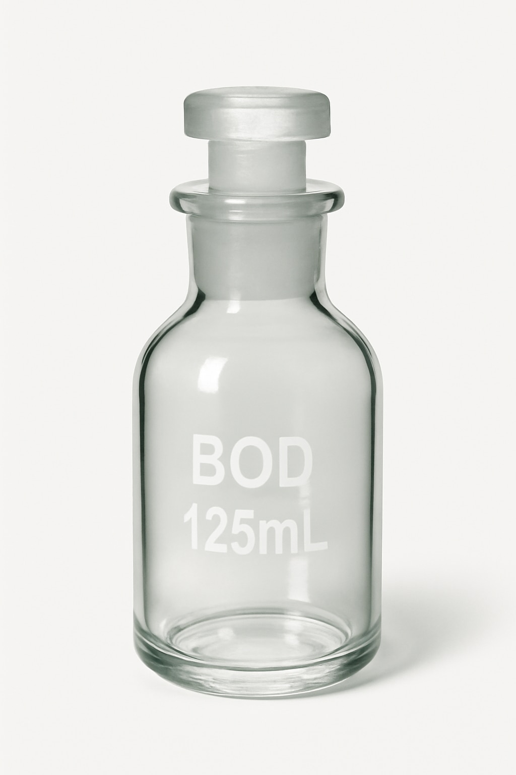 A BOD (Biochemical Oxygen Demand) bottle with a solid stopper and a 125 ml capacity is a specialized laboratory glass container used for measuring the oxygen demand of wastewater and other environmental samples. The bottle is typically made from high-quality glass to minimize gas exchange and contamination. The solid stopper ensures a tight seal, preventing air from entering or escaping, which is critical for accurate measurement of oxygen consumption during incubation. The 125 ml size is standard in environmental and water quality labs, supporting procedures that assess the biodegradability and impact of organic substances in water samples.