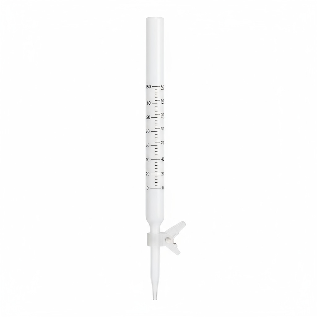 The 50 ml burette is a laboratory glassware instrument, white in color, designed for precise measurement and dispensing of liquid volumes. It features a pinch clip that allows easy control of fluid flow, ensuring accuracy during titrations or other liquid-handling processes. The burette is long and narrow with clear volume markings for precise reading and is commonly used in chemical laboratories for quantitative analysis.