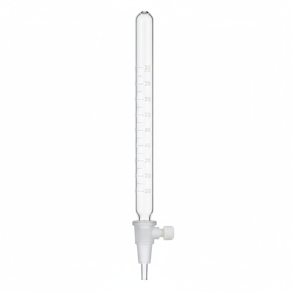 The 25 ml burette is a precision liquid dispensing instrument made from white-colored transparent borosilicate glass. It features a rotaflow stopcock mechanism that allows smooth and accurate control of liquid flow during titration or dispensing processes. The burette is designed for single packing to maintain cleanliness and prevent contamination before use. Its clear volume graduations ensure precise measurement of liquids, making it an essential tool for quantitative laboratory experiments and titrations requiring high accuracy and repeatability.