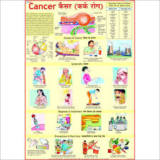 The “Cancer” (50x70 cm) educational chart is a visually engaging, bilingual (English/Hindi) poster that describes the causes, symptoms, prevention, and treatment of cancer in a clear, concise manner suitable for classrooms, clinics, and health centers.​ Chart Features Size: 50x70 cm, laminated for durability, with top and bottom rollers for easy hanging.​ Includes descriptive illustrations showing: What cancer is: uncontrolled growth of abnormal cells anywhere in the body, able to invade nearby tissues and spread to other organs.​ Common causes and risk factors: genetic predisposition, tobacco and alcohol use, unhealthy diet, lack of exercise, chronic infections (e.g., HPV, hepatitis B and C), exposure to radiation or chemicals, and advanced age.​ Typical symptoms: unexplained lumps or swelling, changes in a mole or wart, persistent cough, difficulty swallowing, abnormal bleeding, unexplained weight loss, fatigue, chronic pain, or persistent sores.​ May highlight common childhood and adult cancers such as leukemia, breast, cervix, prostate, lung, colon, and skin cancer.​ Shows prevention steps: No tobacco/alcohol, eat a healthy diet rich in fruits/vegetables, regular physical activity, maintain healthy weight, vaccinate against hepatitis B/HPV, avoid exposure to carcinogens, regular medical checkups, and screenings (Pap smear, mammogram, colonoscopy, etc.).​ Treatment overview includes surgery, radiotherapy, chemotherapy, immunotherapy, and supportive care depending on cancer type and stage.​ Encourages regular self-exams (such as breast self-exam), awareness of early warning signs, and timely medical consultation.​ Educational Value Promotes awareness, early detection, and motivation for healthy lifestyle changes to reduce cancer risk.​ Useful as a reference for science and health lessons, public health campaigns, and patient education in clinics.​ Suitable for all ages due to simple graphics and accessible language, supporting World Cancer Day and year-round health education.​