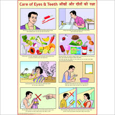 The “Care of Eyes & Teeth” (50x70 cm) educational chart provides primary students with clear, age-appropriate visuals and guidelines for maintaining eye and dental health, supporting personal hygiene lessons and lifelong well-being.​ Chart Features Size: 50x70 cm; multicolor, with illustrations showing children engaging in good eye and dental care habits.​ Presents a side-by-side summary of care tips: For Eyes: Wash eyes with clean water, never rub with dirty hands Read/write with good lighting and proper posture Avoid excessive screen time, rest eyes frequently​ Eat foods rich in vitamin A (carrots, spinach, eggs) Protect eyes from dust and strong sunlight by wearing sunglasses/hats​ Avoid staring at bright lights; get regular eye check-ups For Teeth: Brush teeth twice daily with fluoride toothpaste​ Floss daily and rinse mouth after meals Avoid too many sweets, sticky foods, and sugary drinks​ Eat crunchy fruits and vegetables for healthy teeth and gums​ Visit the dentist regularly for check-ups and cleaning Never use teeth to open things or bite hard objects​ Often includes friendly icons (toothbrush, glasses, healthy food, dentist, sun) and bilingual or multilingual headings for broader accessibility.​ Educational Value Teaches prevention of common eye and dental diseases, emphasizing hygiene and regular health check-ups.​ Encourages health-promoting routines from a young age, supporting overall school and home wellness programs.​ Can be used as a reference in school clinics, classrooms, home study areas, and health camps. This chart is an essential tool for building foundational habits around vision and dental care, helping children protect their health for life