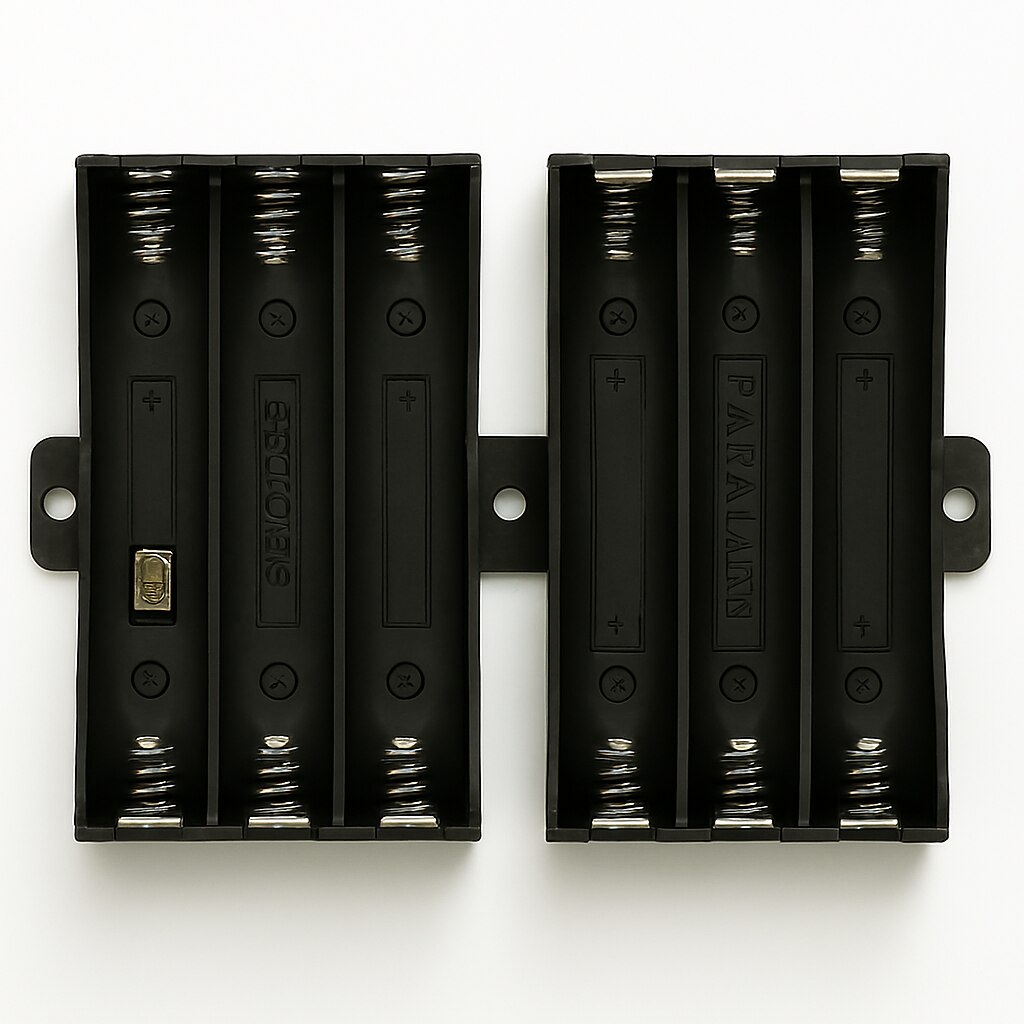 Here’s a detailed description of the image showing two plastic battery holders designed to hold four cylindrical batteries each: --- ### πŸ”‹ Four-Battery Holders – Series vs. Parallel #### 🧱 Material & Structure - **Material**: Durable black plastic with a matte finish - **Shape**: Rectangular with rounded corners - **Mounting Tabs**: Each holder includes side tabs with circular holes for secure attachment --- ### πŸ”Œ Left Holder – SERIES Configuration - **Battery Capacity**: Holds 4 cylindrical batteries in a linear arrangement - **Electrical Layout**: - Each slot has a **silver-colored spring** at one end (negative terminal) - Opposite end features a **gold-colored flat contact** (positive terminal) - **Polarity Markings**: Embossed β€œ+” and β€œβˆ’β€ symbols guide correct battery orientation - **Label**: Embossed with **β€œSERIES”** between the second and third slots - **Function**: Connects batteries in series, multiplying voltage (e.g., 4 Γ— 1.5V = 6V) --- ### ⚑ Right Holder – PARALLEL Configuration - **Battery Capacity**: Also holds 4 cylindrical batteries in a linear arrangement - **Electrical Layout**: - Each slot has **springs and contacts** at both ends, all marked with β€œ+” - **Polarity Markings**: All batteries are inserted with the same orientation - **Label**: Embossed with **β€œPARALLEL”** between the second and third slots - **Function**: Connects batteries in parallel, increasing current capacity while maintaining voltage --- ### πŸ–ΌοΈ Presentation - **Background**: Clean white surface for contrast - **Lighting**: Even and diffused, highlighting texture and details - **Orientation**: Both holders are upright and evenly spaced with a small gap between them --- If you’d like, I can walk you through how to wire these holders or simulate voltage/current behavior for different battery types.