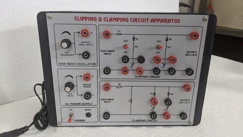 Description Circuit Design: The apparatus features diode-capacitor-resistor networks configured to demonstrate positive and negative clamping operations. Function: Clamping circuits are designed to “clamp” the input waveform to a specified reference voltage, effectively shifting the entire signal vertically on the voltage axis. This does not change the waveform shape, but repositions its baseline. Operation: With a connected signal source (function generator), the user observes how the output waveform is shifted either upwards (positive clamping) or downwards (negative clamping) depending on the circuit configuration. Features: The device offers robust terminals for signal input, test points for waveform measurement, and arrangements for quick selection of clamping direction and reference levels. Output is observed on an oscilloscope for clear visualization. This apparatus is widely used in electronics laboratories to demonstrate DC restoration, baseline adjustment, and signal level shifting techniques essential in analog and communication circuits.The Clamping Circuit Apparatus is a laboratory device designed to demonstrate how clamping circuits modify the DC level of an AC input signal without changing its peak-to-peak amplitude.