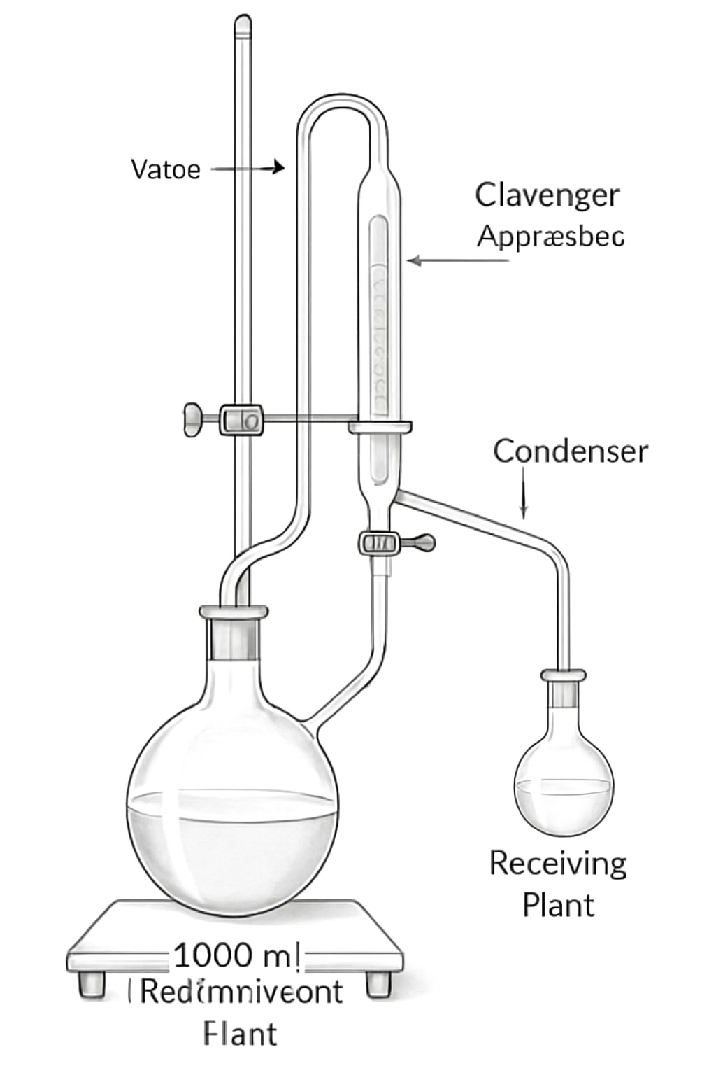 The Clevenger Apparatus with a 1000 ml flask is a laboratory distillation setup mainly used for the extraction of essential oils and volatile compounds from plant materials or other substances. It consists of a 1000 ml round-bottom flask where the sample mixture is heated. The apparatus includes a condenser connected to the flask, allowing vaporized components to condense and separate based on their boiling points. The setup uniquely features a graduated collection tube where the condensed essential oils and water separate into distinct layers, enabling the direct measurement and collection of the extracted oils. This apparatus is widely used in botanical and chemical research due to its efficiency in isolating pure volatile extracts without the need for solvents. The 1000 ml flask size makes it suitable for medium-scale extractions, balancing sample capacity with manageability.
