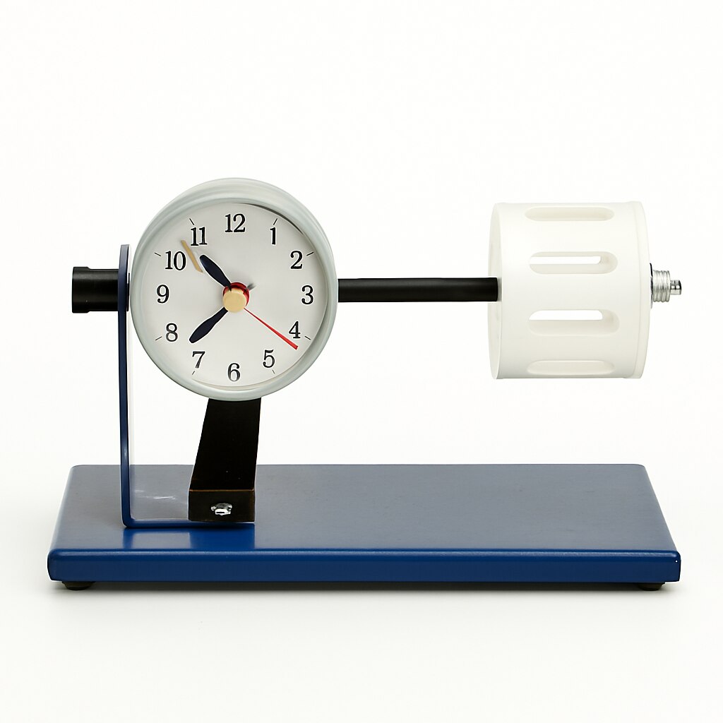 Here’s a detailed description of the **Clinostat (Clock Type)** apparatus shown in the image: --- ### πŸ§ͺ Clinostat (Clock Type) – Laboratory Instrument #### 🧱 Structure & Materials - **Base Platform**: A rectangular, glossy blue metal base that provides stability and support for the entire apparatus. - **Support Arm**: A black L-shaped bracket mounted vertically on the base, holding the clock mechanism securely in place. --- ### ⏱️ Clock Mechanism - **Casing**: Circular, light gray metal housing with a smooth, slightly textured surface. - **Clock Face**: White background with black Arabic numerals (1–12), black hour and minute hands, and a red second hand. - **Time Displayed**: Approximately 10:08. - **Cover**: Transparent glass or plastic protecting the clock face. --- ### πŸ”„ Rotating Assembly - **Horizontal Rod**: Black cylindrical metal rod extending from the center of the clock casing to the right. - **Sample Holder**: White cylindrical plastic drum attached to the end of the rod. - **Design**: Perforated with evenly spaced horizontal slots for ventilation and visibility. - **Attachment**: Secured with a silver metal bolt and wingnut for easy adjustment or removal. --- ### πŸŽ“ Purpose & Function - A **clinostat** is used to simulate microgravity by slowly rotating biological samples (like plant seedlings) around a horizontal axis. - The **clock mechanism** drives the rotation at a consistent speed, minimizing the directional influence of gravity over time. - Commonly used in **botany, space biology, and plant physiology** experiments to study how organisms respond to altered gravitational conditions. --- Let me know if you’d like a diagram showing how it works or examples of experiments that use this setup!