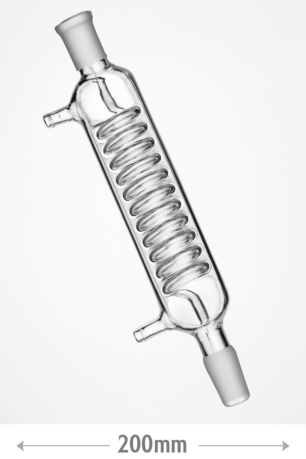 A coil condenser 200 mm is a laboratory glass apparatus designed to cool and condense vapors during distillation or reflux processes. It features a helical coil inside a cylindrical glass body, which provides a large surface area for efficient cooling when surrounded by a coolant such as water. The 200 mm length indicates the size of the condenser, making it suitable for small to medium-scale laboratory applications where effective condensation is required.