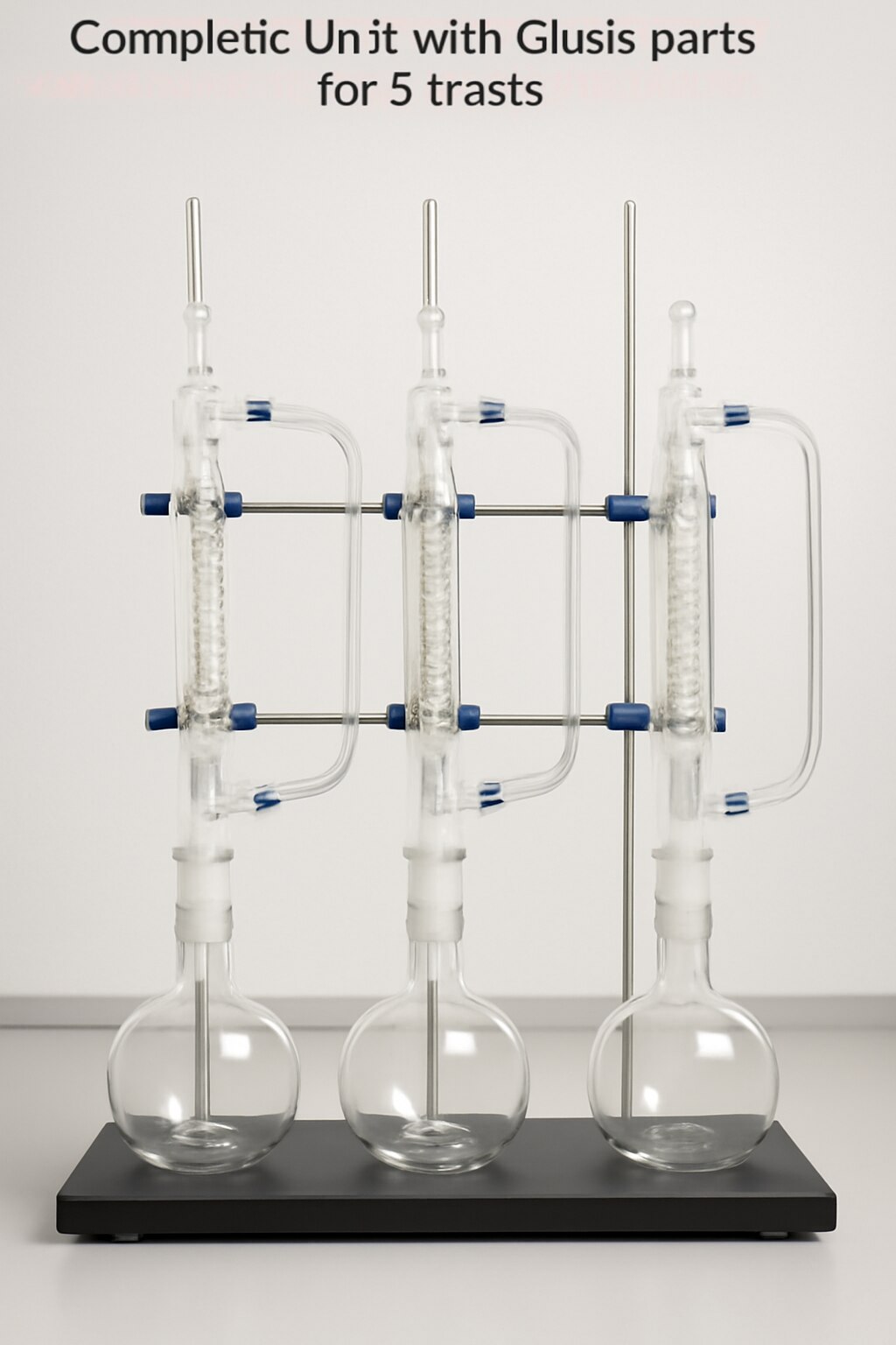 The complete unit with glass parts for 3 tests is a fully integrated laboratory apparatus designed to facilitate three parallel experiments or distillations. This unit includes essential glass components such as three 500 ml flasks, condensers, receivers, and interconnecting glass tubing, all mounted on a sturdy framework for stability and ease of use. The glassware allows clear visibility of the process, excellent chemical resistance, and precise control over experimental conditions. Ideal for research, quality control, and educational applications, this setup enables high-throughput testing with consistent results, facilitating simultaneous operations within a compact and organized structure.