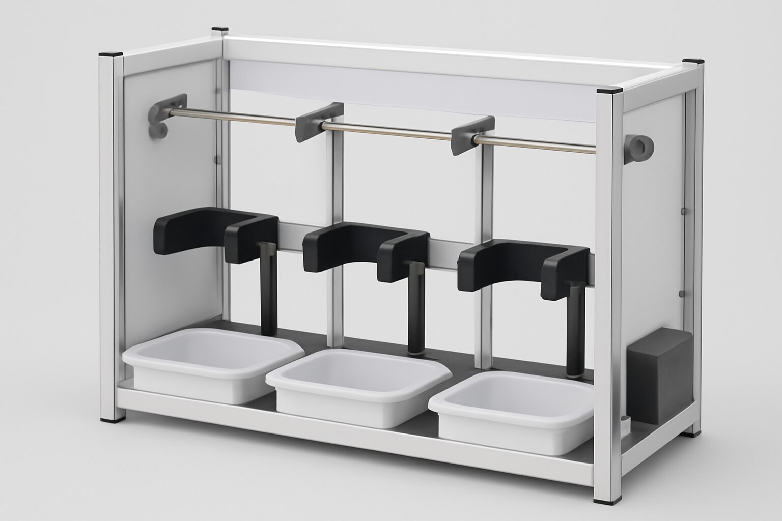 The complete unit without glass parts for 3 tests is a lab apparatus framework designed to accommodate three parallel experiments or processes without any glass components. It consists mainly of a sturdy metal and plastic structure that supports various laboratory operations with flexibility for customization. This unit is ideal when glassware is not needed or when durability and frequent changes, cleaning, or maintenance of the setup are required. By excluding glass, it reduces the risk of breakage and makes the system more robust for practical, educational, or industrial applications where glass transparency and chemical resistance are not essential.