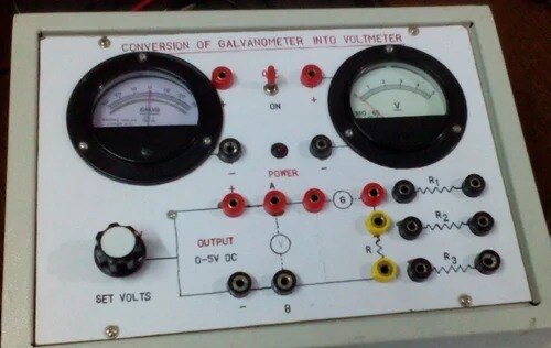Principle: A galvanometer measures small currents, but to measure voltage, it must be modified to withstand higher voltages without full-scale deflection. This is achieved by connecting a high resistance (known as a “multiplier resistor”) in series with the galvanometer. Apparatus: A sensitive galvanometer, A precision series resistor (multiplier), Connecting wires, Terminals and a calibrated scale. Operation: When voltage is applied across the combination, only a tiny fraction of current (proportional to the voltage) passes through the galvanometer, protecting the coil and ensuring readings within the instrument's range. The scale is then calibrated in volts instead of amperes or milliamperes. Formula: The total resistance R R required in series is R = V I g − G R= I g V −G where V V is the maximum voltage to be measured, I g I g is the full-scale deflection current of the galvanometer, and G G is its internal resistance. This conversion apparatus is invaluable for educational demonstrations, showing practical applications of Ohm’s Law and extending the utility of a galvanometer for voltage measurements.
