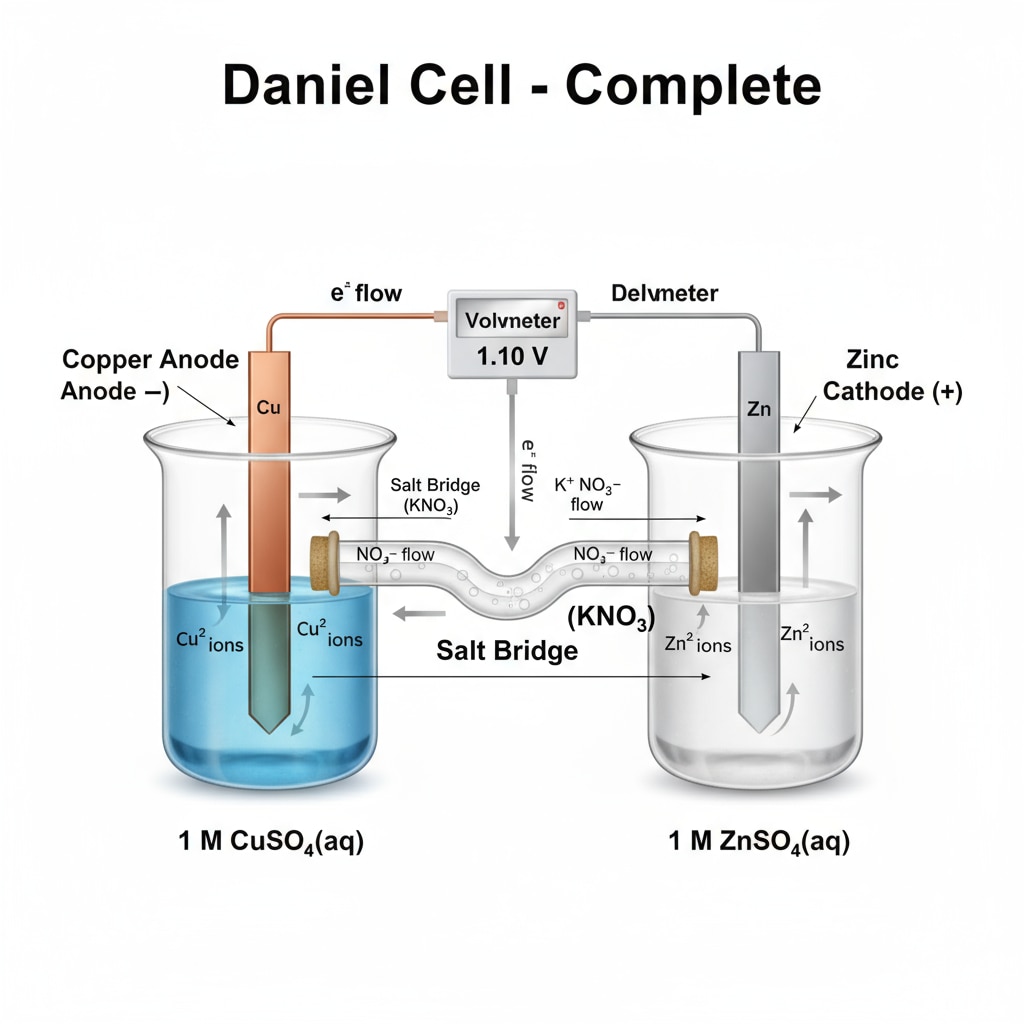 A Daniel Cell is a type of electrochemical (galvanic) cell that converts chemical energy into electrical energy through a spontaneous redox reaction involving zinc and copper. It was invented in 1836 by John Frederic Daniell and marked a significant advancement in battery technology by addressing limitations found in earlier voltaic cells. Construction The Daniel Cell consists of two half-cells: Zinc electrode in zinc sulfate (ZnSO₄) solution: This forms the anode (negative electrode), where zinc undergoes oxidation, releasing electrons and forming zinc ions into the solution. Copper electrode in copper sulfate (CuSO₄) solution: This acts as the cathode (positive electrode), where copper ions from the solution accept electrons and get deposited as metallic copper on the electrode (reduction). The two solutions are usually separated by a porous membrane or a salt bridge, which maintains electrical neutrality by allowing ion flow, but prevents the solutions from mixing directly. Working Principle The Daniel Cell operates based on the following redox reactions: At the anode (zinc): Zn (s) → Zn²⁺ (aq) + 2e⁻ (oxidation). At the cathode (copper): Cu²⁺ (aq) + 2e⁻ → Cu (s) (reduction). Electrons released at the zinc electrode travel through the external circuit to the copper electrode, generating an electric current. Simultaneously, the salt bridge or porous membrane allows ions to flow between the solutions to maintain charge balance. The overall cell reaction is: Zn (s) + Cu 2 + ( aq ) → Zn 2 + ( aq ) + Cu (s) Zn (s) + Cu 2+ (aq)→Zn 2+ (aq)+Cu (s) This reaction typically provides a voltage of around 1.1 V under standard conditions. Features and Applications Efficiently transforms chemical energy into electrical energy. Reliable, steady source of voltage, making it a reference for the standard definition of the volt. Historically used as a power source for telegraphy and experimentation in electrochemistry. Demonstrates the fundamental principles of batteries and galvanic cells, and is commonly studied in chemistry and physics classes. The Daniel Cell remains an important educational and scientific tool for illustrating basic electrochemical reactions and the conversion of chemical to electrical energy.