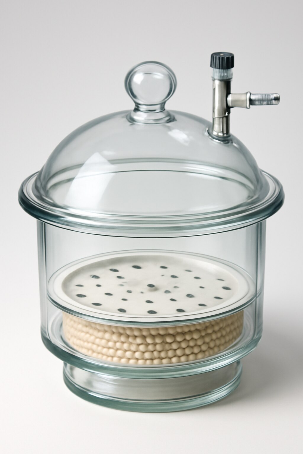 A vacuum desiccator is a sealed glass container with a drying agent and a vacuum nozzle to remove air, used to keep samples dry and moisture-free in low-pressure conditions(see the generated image above).