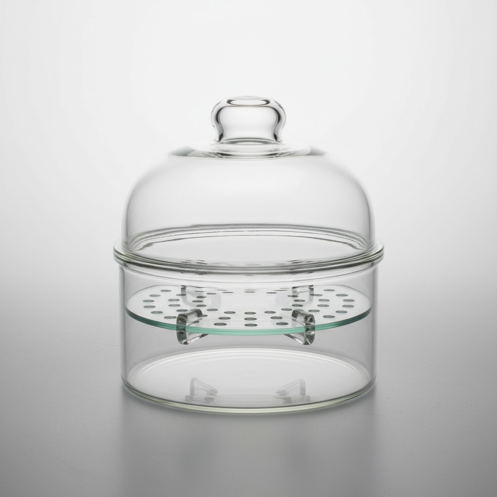 A desiccator is a sealable container used in laboratories to store and protect samples or chemicals sensitive to moisture. It typically consists of two main parts: a base and a cover that fits tightly to form an airtight seal. The base holds a desiccant material such as silica gel, which absorbs moisture from the air inside, creating a dry environment to prevent contamination or degradation of the stored items. Desiccators are commonly made from glass or plastic and come in a variety of sizes, often round or bell-shaped. They are essential for drying samples before weighing, storing hygroscopic substances, and protecting reagents or materials during experiments. Some models include vacuum capabilities for enhanced moisture removal. Desiccators help maintain sample integrity, prevent moisture damage, and are reusable with periodic replacement or regeneration of the desiccant.