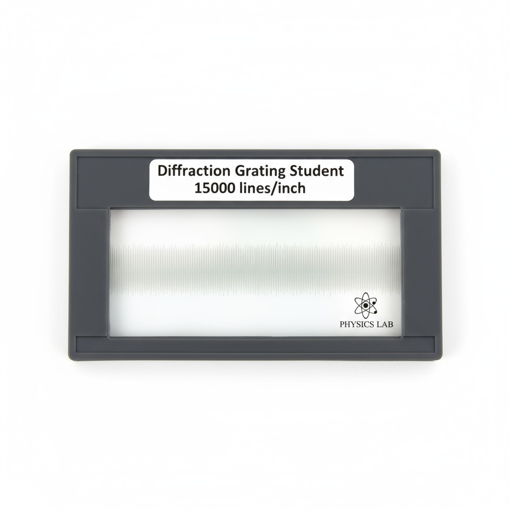 The Diffraction Grating Student model with 15,000 lines (equivalent to 600 lines per millimeter) is specially designed for educational and scientific experiments involving light and optics. It is commonly used with spectrometers for studying the properties of light, including wavelength dispersion and spectral analysis. Description and Features: High Line Density: Features 15,000 lines per inch (600 lines/mm), allowing precise separation of light into its component colors for detailed spectral analysis. Material: Made from high-quality, transparent glass or plastic material that ensures durability and accurate experimental results. Compatibility: Compatible with a wide range of optical instruments, especially spectrometers used in laboratories and classrooms. Educational Utility: Tailored for students and educators to facilitate hands-on learning of optical experiments, such as studying light diffraction, color separation, and wavelength determination. Precision Grooves: Closely spaced parallel grooves on a flat surface designed to produce sharp and clear diffraction patterns necessary for scientific inquiry. Size and Mounting: Typically mounted within a glass frame or protective casing, making it easy to handle and integrate into experimental setups. Applications: Used widely in physics and chemistry education for experiments like measuring wavelength of monochromatic light, studying interference patterns, and general spectroscopy. This student diffraction grating model provides an accessible and reliable tool for exploring foundational concepts in optics, aiding in the development of practical skills and scientific understanding in academic settings.