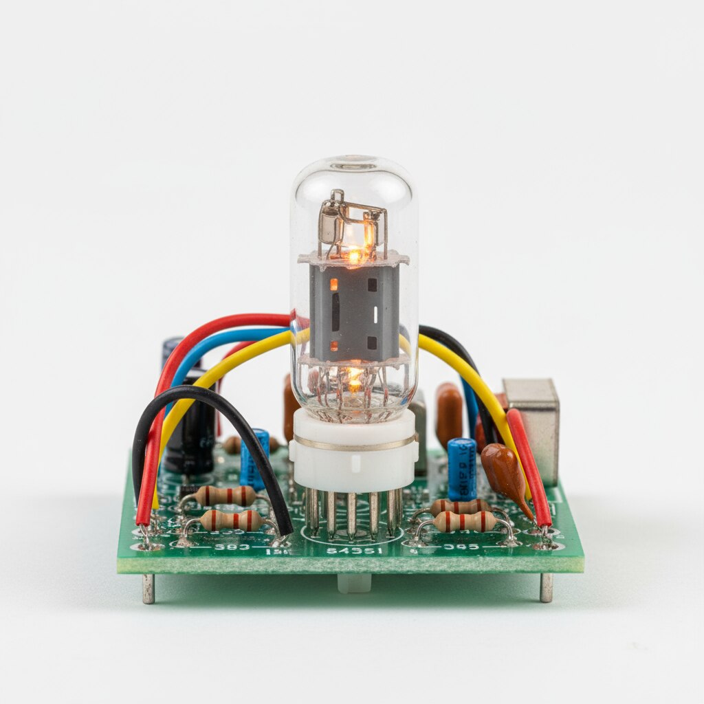 The Diode Valve (6AL5) mounted on board is a miniature dual diode vacuum tube used extensively in signal detection, demodulation, and AM/FM radio applications. It integrates two diode units in a compact 7-pin miniature glass envelope, providing high efficiency and reliability. Key Features Dual Diode Construction: Two independent diodes housed within a single glass tube, separated by metal electrodes to prevent interference. Heater Voltage: Operates on a 6.3V filament with approximately 0.3A heater current, designed for low power consumption and small size. Applications: Ideal for FM and AM detector circuits, signal rectification, and audio demodulation in vintage radio receivers and test equipment. Size & Package: Compact 7-pin miniature construction for easy integration on experimental or demonstration boards. High perveance: Enables efficient operation at high frequencies (up to 700 MHz resonant frequency), suitable for modern and legacy radio applications. Historical Usage: Widely utilized in mid-20th-century radios and electronic devices due to its versatility and dependable diode performance. Usage Notes Provides clean, low-noise diode operation, critical for accurate signal detection. Often found in vintage electronics restoration and educational setups for demonstrating diode characteristics. This 6AL5 diode valve on board serves as an effective, classic solution for dual diode functionality with compact design and high performance in radio and electronic signal detection tasks.