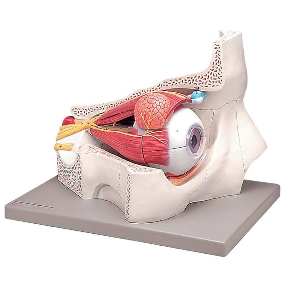 The human eye with orbit refers to the eyeball and its supporting structures housed within the bony cavity of the skull called the orbit. Orbit: Bony Eye Socket The orbit is a pyramidal cavity formed by seven bones: maxilla, zygomatic bone, frontal bone, ethmoid bone, lacrimal bone, sphenoid bone, and palatine bone. It hosts the eyeball along with extraocular muscles, fat, nerves, blood vessels, and the lacrimal (tear) gland. The orbit provides structural support and protection to the eye and creates pathways for critical nerves and blood vessels through openings like the optic canal and superior orbital fissure. Eye Structure Within the Orbit The eyeball itself is a spherical structure with three main layers: the outer fibrous layer (sclera and cornea), the middle vascular layer (choroid, ciliary body, iris), and the inner neural layer (retina). The optic nerve exits the back of the eye through the orbit, relaying visual information to the brain. Extraocular muscles attached to the eye and orbit walls control voluntary eye movement. Key Functions The orbit's structure shields the eye from trauma, helps maintain its position, and houses tissues vital for eye mobility and function. Multiple foramina and fissures in the orbit allow passage for nerves such as the optic nerve (CN II), oculomotor (CN III), trochlear (CN IV), abducens (CN VI), and the ophthalmic branch of the trigeminal nerve (CN V).