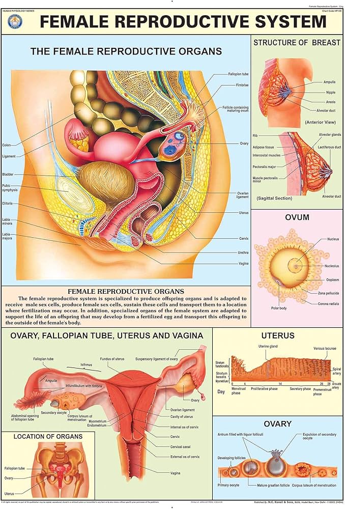 The “Female Reproductive System (70x100cm)” chart is a comprehensive anatomical wall poster designed for education and reference in classrooms, clinics, or medical training environments. It visually details the structure and function of the female reproductive organs in a clear, large format suitable for group viewing.​ Key Features The chart displays the full anatomy of the female reproductive system, including internal organs like the ovaries, fallopian tubes, uterus, cervix, and vagina.​ External genitalia (vulva), mammary glands, and related structures are shown with distinct, labeled diagrams.​ Some versions provide anterior, lateral, and dorsal views of the pelvis and torso, alongside enlarged views illustrating the detailed structure of an ovum and the mammary gland.​ Diagrams of the menstrual cycle, ovulation process, and an overview of hormone regulation are often included for better understanding of physiological functions.​ The poster is made from durable materials such as laminated or plastic foil and often features metal edging for hanging, ensuring long-lasting display in active environments.​ Educational Use Ideal for use in biology classrooms, gynecology or health education settings, and medical clinics for student revision, patient education, or reference.​ The large 70x100cm size enables clear visibility of anatomical details and labels, making it suitable for demonstrations and instruction in group settings.​ The chart is available in various print types and languages, often with emphasis on durability and visual clarity.