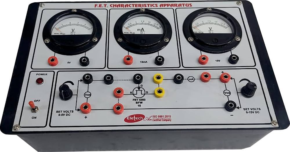 The FET Characteristics Apparatus with Regulated Power Supplies is a laboratory instrument designed to study and plot the input and output characteristics of a Field Effect Transistor (FET) using precise voltage control. The setup typically includes two continuously variable DC regulated power supplies (for example, 0-15V and 0-5V), voltmeters, ammeters, and connection terminals arranged on a board for straightforward experimental use. Key Features The apparatus allows the measurement of both drain and transfer characteristics of a FET by providing controlled DC voltages to the circuit. Common features include BFW10 FET (or equivalent), breadboard or fixed connections, switches, and clear connection points for source, gate, and drain terminals. High-quality regulated power supplies ensure accurate readings and repeatable experiments by eliminating voltage fluctuations. Built-in analog meters display voltages and currents for monitoring circuit behavior in real time. Principle of Operation The FET is a three-terminal device: Source, Gate, and Drain. The voltage applied to the Gate controls the current between the Source and Drain, making the FET a voltage-controlled device. By plotting the drain current (ID) versus drain-source voltage (VDS) for various fixed gate-source voltages (VGS), students can observe Ohmic, Cut-off (Pinch-off), Saturation (Active), and Breakdown regions of the transistor. The high input impedance and low noise characteristics of the FET are highlighted during these experiments, making it a useful teaching tool for amplifier and switching circuit studies. Applications Used in electronics and physics laboratories to teach and demonstrate FET operation and characteristics. Suitable for both undergraduate and research-level studies focused on analog electronics, circuit analysis, and transistor behavior. In summary, this apparatus is essential for hands-on learning about FETs, providing stable and accurate means to explore essential properties and practical applications of modern semiconductor devices.