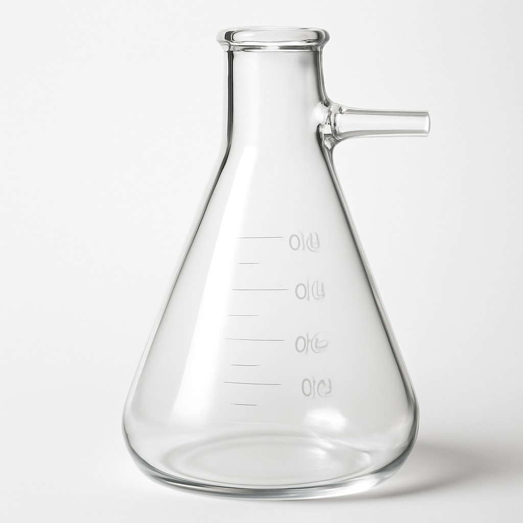 Filtration Flask 1 Litre (1000 ml) The Filtration Flask, with a 1000 ml capacity, is constructed from heavy-wall borosilicate glass 3.3, offering superior resistance to thermal shock and chemical corrosion for reliable laboratory use. It features a conical Erlenmeyer shape with thick walls designed to safely withstand vacuum pressure during filtration. Equipped with a side-arm tubulation, the flask connects easily to vacuum pumps or water jet pumps for effective filtration processes. Graduated volume markings provide convenient measurement up to 1000 ml, and the neck fits standard rubber stoppers ensuring a tight seal during operation. This flask complies with ISO 6556 and DIN 12476 standards, making it essential for chemical, microbiology, environmental testing, and filtration applications in laboratories.