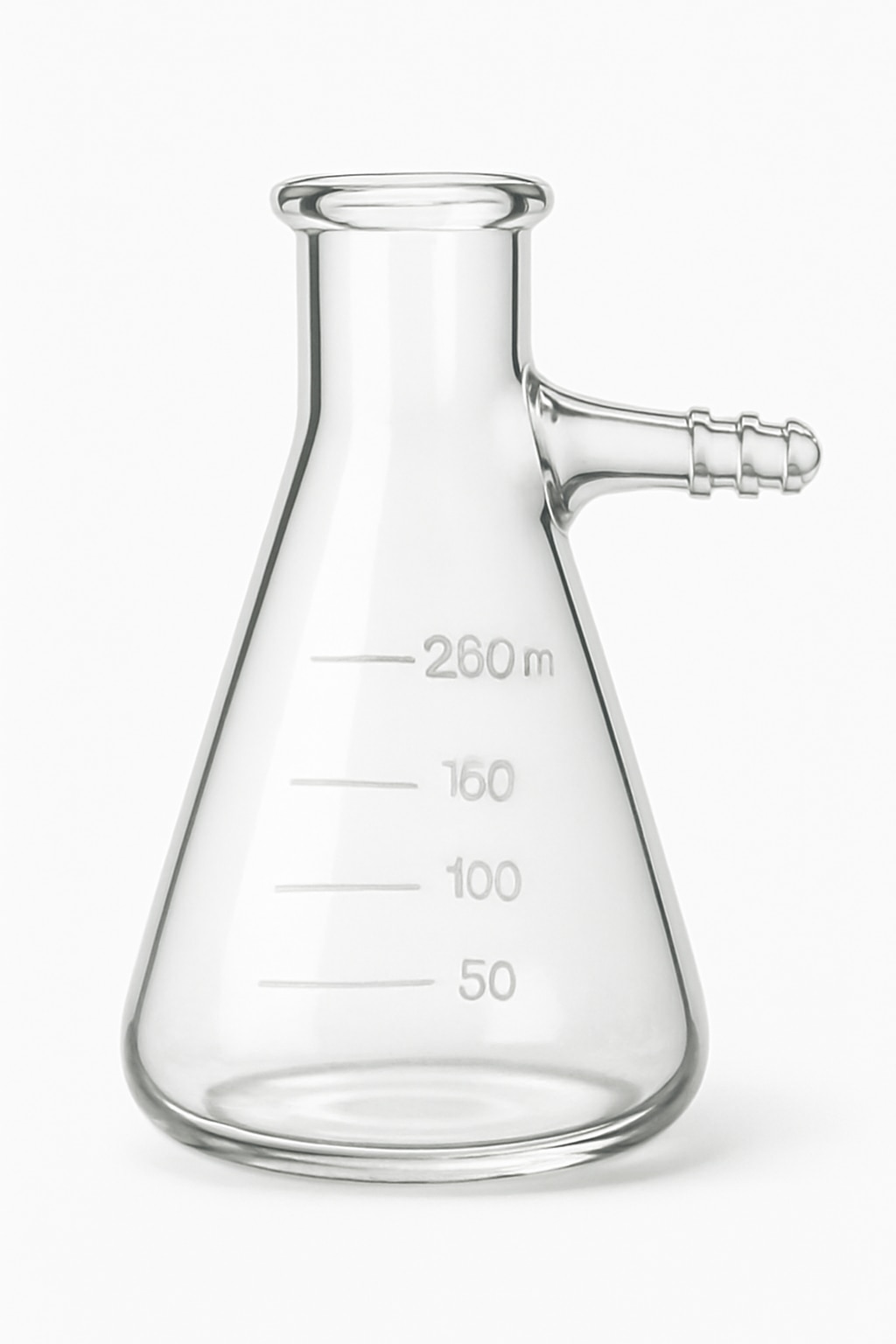 A filtration flask, also known as a vacuum flask or Büchner flask, with a 250 ml capacity is a type of laboratory glassware designed for filtration processes under reduced pressure. It is typically made of thick-walled borosilicate glass to withstand the vacuum pressure applied. This flask features a flat bottom and a side arm or hose connector near the neck to attach to a vacuum pump, which helps pull liquid through a filter. The 250 ml size is common for small-scale filtration tasks in chemical, biological, and environmental laboratories where rapid and efficient filtering of liquids is required.