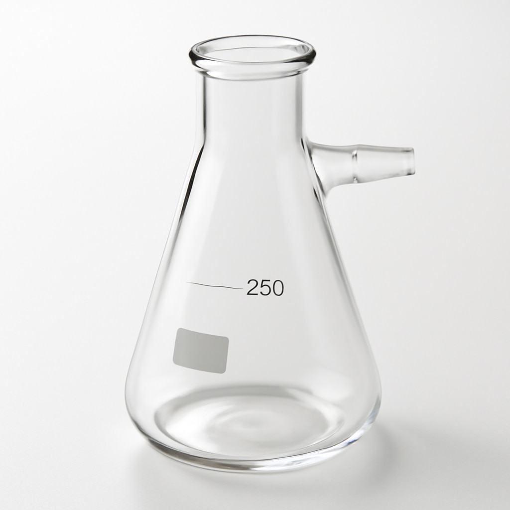 Filtration Flask 250 ml The Filtration Flask, 250 ml capacity, is a heavy-duty laboratory flask made from high-quality borosilicate glass 3.3, designed to withstand pressure differentials and thermal shock. It features a side-arm tubulation for vacuum filtration applications, securely connecting to vacuum systems for efficient fluid removal. This flask has convenient graduation markings from 75 ml to 250 ml and a narrow neck compatible with standard rubber stoppers to ensure a tight seal. Its conical Erlenmeyer shape and reinforced thick walls comply with ISO 6556 and DIN 12476 standards for durability and reliability in chemical analysis, microbiology, and environmental testing. The flask should not be heated during use as it is intended for vacuum filtration only.