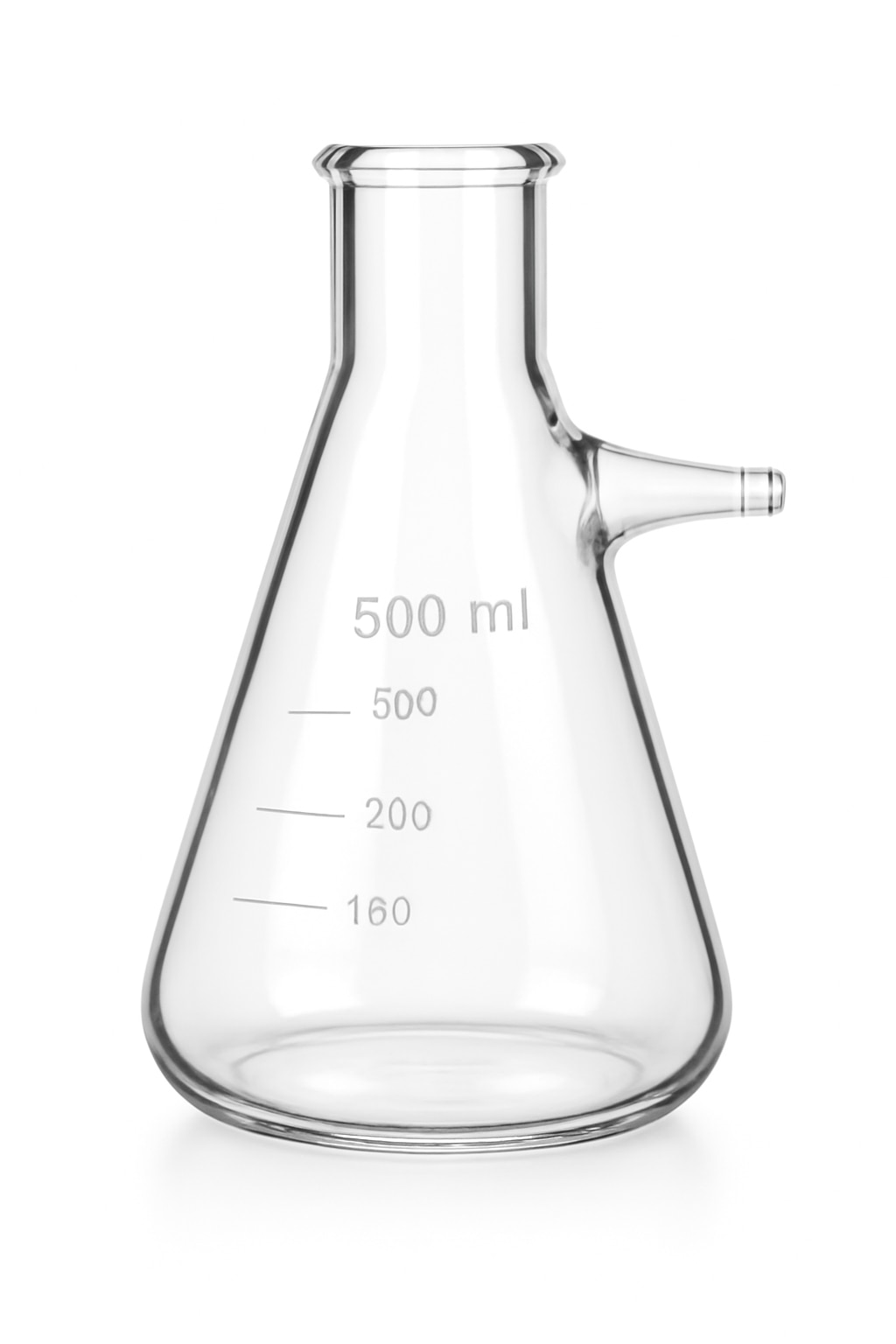A filtration flask with a 500 ml capacity is a laboratory glass vessel designed for vacuum filtration processes. It usually has a thick-walled body made of borosilicate glass to endure vacuum pressure without breaking. This flask includes a side arm or hose connector that attaches to a vacuum source, creating reduced pressure to facilitate faster filtration through a filter paper or membrane placed on top of a funnel. The 500 ml size makes it suitable for medium-scale filtration tasks in chemical, biological, and environmental laboratories aiming for efficient solid-liquid separation.