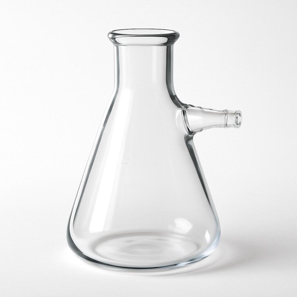 Filtration Flask 500 ml The Filtration Flask, 500 ml capacity, is crafted from high-quality borosilicate glass 3.3, known for its durability, thermal resistance, and chemical inertia, making it suitable for rigorous laboratory use. Featuring an Erlenmeyer conical shape and thick walls, this flask is designed for vacuum filtration applications with a side arm (tubulation) for attaching to vacuum pumps or water jet pumps. Graduated markings assist in approximate volume measurement, and its narrow neck allows use with standard rubber stoppers to secure the flask during filtration processes. The flask complies with ISO 6556 and DIN 12476 standards, making it an essential tool for chemical analysis, microbiology, and environmental testing labs.