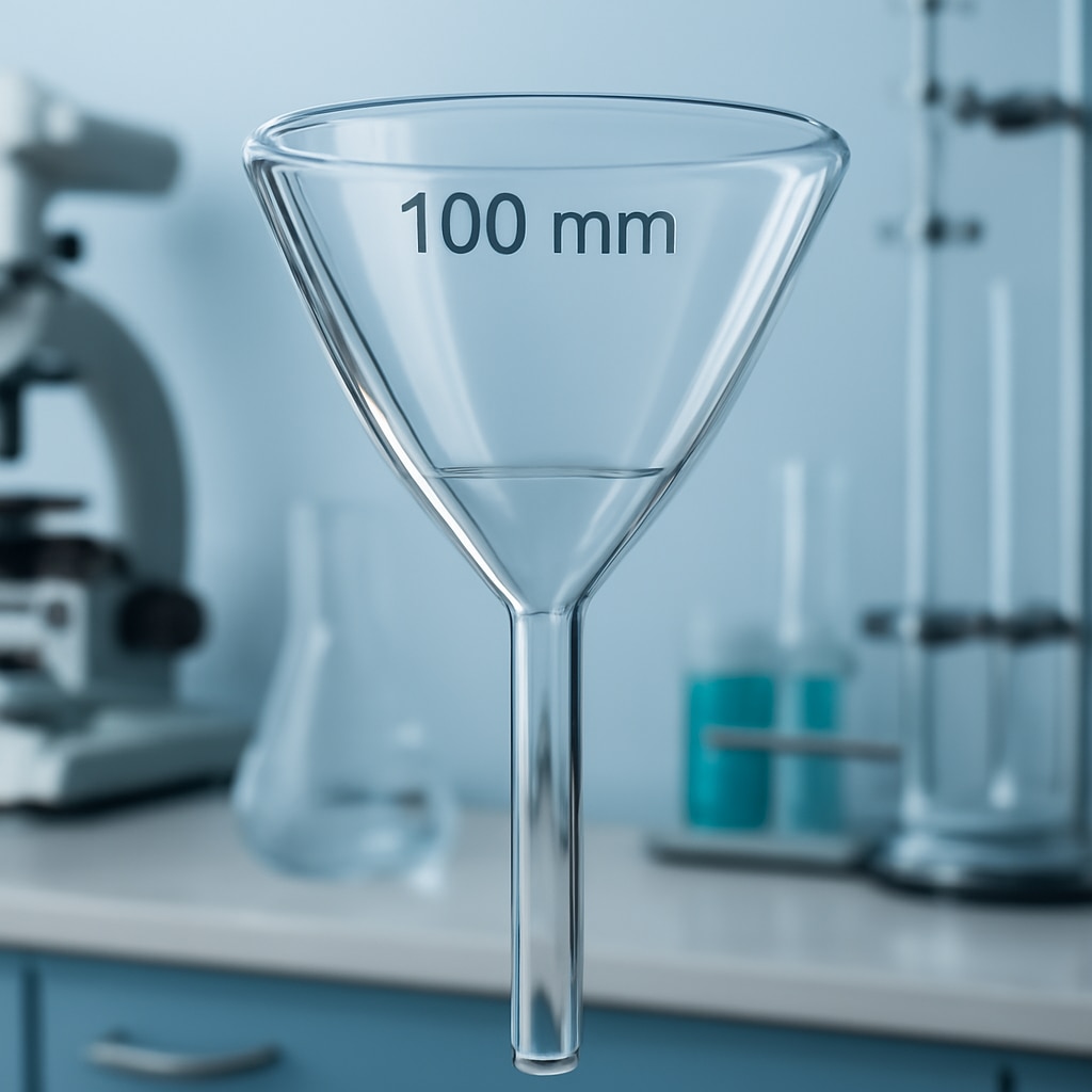 The 100 mm Filtering Funnel is a premium laboratory glassware made from high-quality borosilicate glass 3.3, designed for optimal thermal shock resistance and chemical durability. Featuring a 60° cone angle, it is perfectly suited for fitting filter papers sized 110 to 125 mm in diameter. The funnel includes a short stem for efficient and controlled liquid transfer and filtration. It complies with ISO 4798 and DIN standards, ensuring consistent quality and reliable performance in various laboratory filtration procedures. The transparent glass body allows clear visualization of the filtration process, facilitating safe and accurate laboratory work. Ideal for chemical, pharmaceutical, and scientific labs requiring precise liquid filtration.