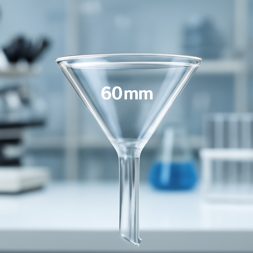 The 60 mm Filtering Funnel is a precision-crafted laboratory glassware made from borosilicate glass 3.3, ensuring high thermal shock resistance and chemical durability. Designed with a 60° cone angle, it provides an optimal fit for filter papers ranging from 70 to 90 mm in diameter. The funnel features a short stem with an 8 mm diameter and a length of approximately 100 mm, making it ideal for various filtration tasks. Compliant with ISO 4798 standards, this funnel delivers reliable performance for laboratory filtration, separation, and liquid transfer applications. Its transparent construction allows easy observation of the filtration process, enhancing efficiency and safety in laboratory operations.