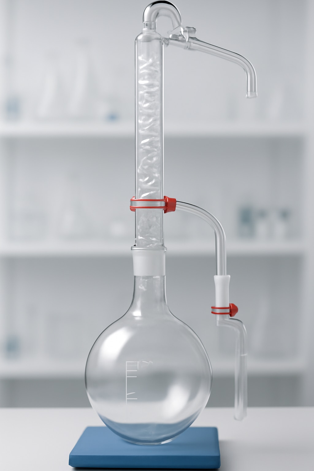 The Clevenger Apparatus with a 2000 ml flask capacity and a 400 mm condenser is a large-scale laboratory distillation apparatus designed for efficient extraction of essential oils and volatile compounds. The 2000 ml flask allows for processing significant sample volumes, suitable for industrial research or production scale extractions. The 400 mm condenser length ensures effective vapor condensation and cooling, which is critical for maintaining the integrity and purity of the extracted oils. This setup includes a graduated collection tube, enabling accurate measurement and collection of the oil-water distillate layers. Its design supports high-capacity distillation with improved efficiency, making it valuable in both research laboratories and commercial essential oil extraction operations.