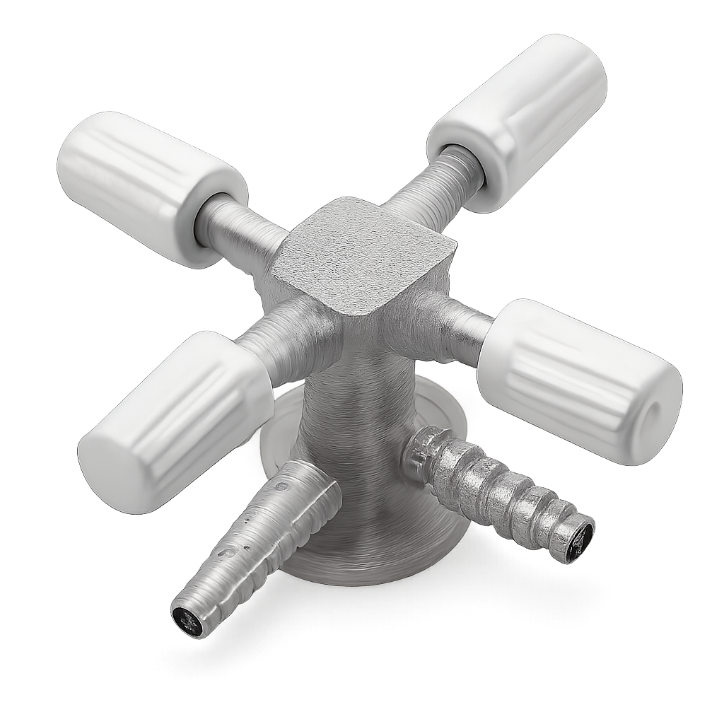 A four-way gas tap is a bench-mounted laboratory fitting designed to supply gas safely and efficiently to four separate outlets from a single unit, making it ideal for multipoint gas distribution in science labs. It is constructed from solid brass and coated with Rilsan plastic, making it durable, corrosion-resistant, and compliant with safety standards such as British Gas and BSI certifications. Key Features Four outlets with drop lever operation for easy and quick control of gas supply to multiple devices or workstations. Suitable for both natural and LPG gas applications providing versatility in laboratory setups. Body color usually white (RAL 9016) with high-visibility yellow levers for easy identification and safety checks. Maximum working pressure: 20–25 Mbar, with a flow rate of approximately 1 cubic meter/hour per nozzle at 20 Mbar. Includes installation template, anti-rotation pin, and back nut for secure and stable bench mounting. Non-Return Valve (NRV) options available to prevent backflow and enhance safety in case of hose failure. Typical Use This four-way gas tap is widely used in educational, research, and industrial laboratories where multiple gas outlets are required at a single bench, ensuring safe, controlled, and economical gas distribution across multiple users or instruments. Related What are the key safety features of four-way gas taps How to select the right gas tap for specific applications What are the installation steps for a gas tap How do non-return valves improve gas safety Which materials are most durable for gas taps