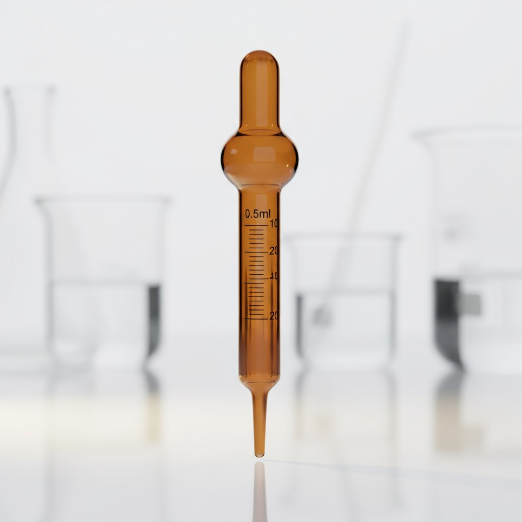 A Graduated Pipette (Amber Color) with 0.5 ml capacity is a laboratory instrument designed for precision measurement and transfer of small liquid volumes. The amber coloration helps protect light-sensitive substances by filtering out harmful UV and visible light. Made from borosilicate glass with a durable amber stain, it offers excellent chemical resistance and clarity for easy reading. Key Features Constructed from high-quality borosilicate glass with amber stain applied via silver diffusion ink. Graduated in clear amber markings for visibility and contrast. Conforms to Class A or AS standards for volumetric accuracy, calibrated “to deliver” (TD). Typical length around 360 mm with fine graduations down to 0.01 ml increments. Durable and resistant to chemical reagents with long service life. Supplied with individual calibration or conformity certificates. Ideal for safe handling and measurement of photoreactive or light-sensitive chemicals. This amber graduated pipette ensures reliable, accurate volume delivery and protection of sensitive samples during laboratory use.
