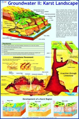 The “Groundwater: Karst Landscape (50x70cm)” chart visually explains how groundwater interacts with soluble bedrock to create distinctive surface and underground features known as karst landforms. This educational poster is ideal for geography and earth science teaching, providing detailed diagrams and labels of karst processes and features.​ Key Features The chart illustrates the appearance and structure of classic karst landscapes: Surface features: sinkholes (dolines), sink points (swallets or ponors), disappearing streams, uvalas (merged sinkholes), solution valleys, and limestone pavements.​ Subsurface features: caves, caverns, underground drainage networks, stalactites and stalagmites within caves, and groundwater pathways.​ Other features: springs (emerging groundwater), karst towers, and dry valleys (ephemeral surface flow).​ Diagrams highlight the movement of water through fractured limestone or similar soluble rocks, showing how chemical weathering (solution) progressively enlarges joints, bedding planes, and other weaknesses, forming complex drainage systems.​ Colorful cross-sections reveal zones of soil, epikarst (weathered zone at the top of the rock), saturated aquifers, and the connectivity between surface water and groundwater in karst.​ The chart often labels human impacts and the vulnerability of karst aquifers to contamination due to rapid water movement through large underground conduits, bypassing natural filtering.​ Educational Use Designed for classroom, laboratory, or field study environments, the 50x70cm format ensures clarity in group teaching and as a wall reference.​ Supports curriculum topics in geology, hydrogeology, and environmental science, connecting groundwater flow with unique landforms and real-world water resource issues.