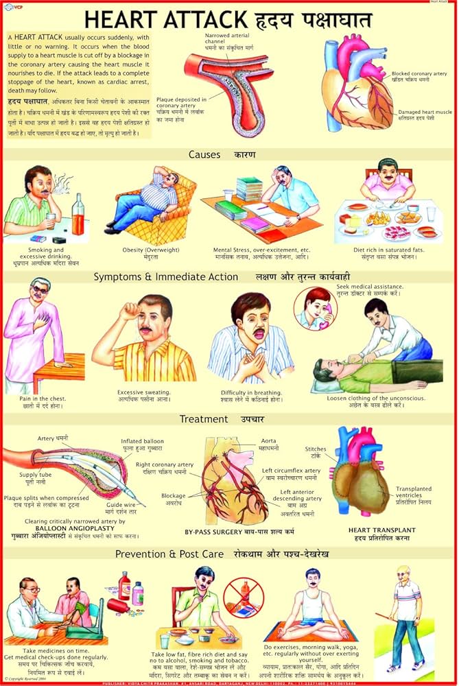 The “Heart Attack” (50x70 cm) educational chart uses clear illustrations and simple language to teach the causes, warning signs, immediate actions, and preventive measures of heart attacks—making it ideal for classrooms, clinics, and community health spaces.​ Chart Features Size: 50x70 cm, double-laminated, and available in English and Hindi with colorful and descriptive visuals for universal understanding.​ Causes: Explains that heart attacks (myocardial infarction) occur when blood flow to part of the heart is blocked, often due to buildup of cholesterol-rich plaques in coronary arteries; risk factors include smoking, high blood pressure, diabetes, obesity, and lack of physical activity.​ Warning Signs: Chest pain or discomfort (pressure, squeezing, fullness, or pain) in the center or left side of the chest Pain or discomfort in arms, back, neck, jaw, or upper abdomen Shortness of breath, cold sweat, nausea, lightheadedness, or fatigue For women, additional symptoms can include unusual tiredness, anxiety, vomiting, and upper back pain (often without chest pain).​ Immediate Actions: Call emergency services immediately (e.g., 911) Sit or help the person sit, rest, and keep calm Loosen tight clothing​ Give chest pain medication (like prescribed nitroglycerin) if available and appropriate If unresponsive and no pulse, begin CPR; use AED if available (illustrated steps may appear on the chart).​ Prevention: Don’t smoke, exercise regularly, maintain a healthy diet, control blood pressure, cholesterol, and diabetes, manage stress, and attend regular checkups.​ Educational Value Encourages early recognition of symptoms, prompt emergency action, and long-term prevention for all ages.​ Reinforces health literacy, community response, and school-based health education. Serves as a quick visual reference for first aid, helpful for students, teachers, fitness trainers, and the public. This chart is a vital health resource for lifesaving education on heart attack recognition, response, and prevention.
