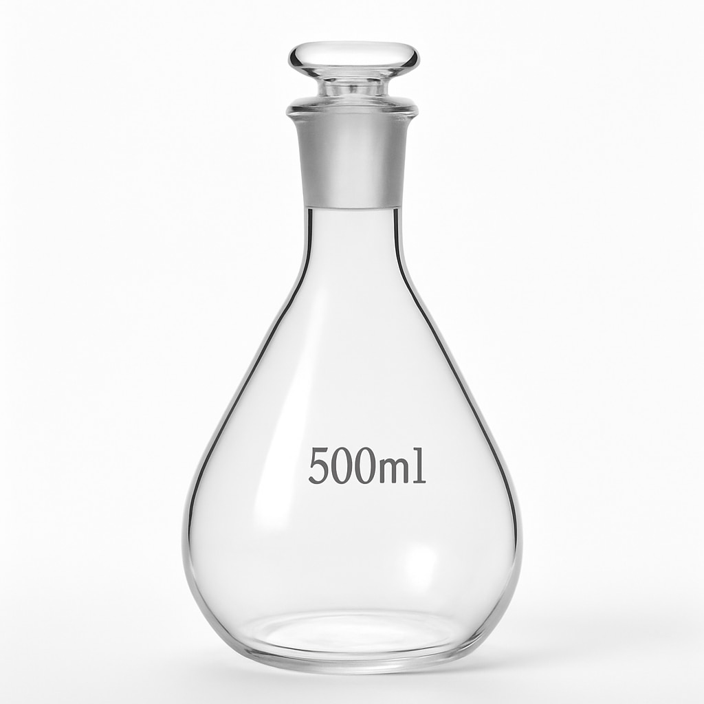 Iodine Flask with Stopper 500 ml The Iodine Flask with Stopper, 500 ml capacity, is crafted from high-quality borosilicate 3.3 glass, which provides excellent resistance to thermal shock and chemical corrosion. Designed for iodine determination and related laboratory analyses, the flask features a conical shape with a ground glass interchangeable stopper to ensure an airtight seal and prevent contamination. It has a standard taper joint size typically 24/29 or 29/32 for compatibility with various laboratory setups. The flask stands approximately 190 mm tall and has a sturdy base diameter of about 105 mm, allowing stable placement during experiments. This flask is ideal for chemical, pharmaceutical, and research laboratories requiring precision and durability in iodine analysis.
