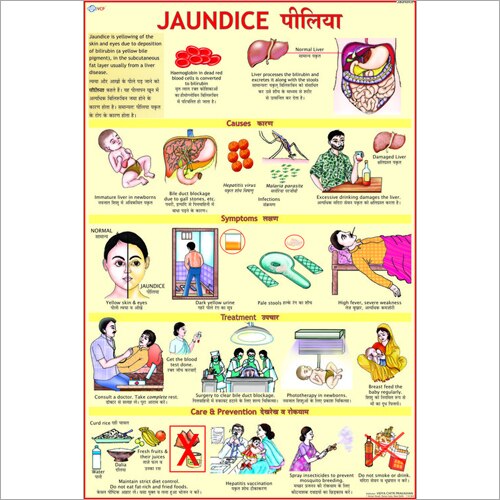 The “Jaundice” (50x70 cm) educational chart provides a visual summary of the causes, symptoms, types, and prevention of jaundice, using straightforward language and colorful illustrations suitable for classrooms, clinics, and community health education.​ Chart Features Size: 50x70 cm, laminated, often bilingual (English and Hindi), with bold headings, process diagrams, and body illustrations.​ Definition: Jaundice is the yellowing of the skin and eyes caused by excess bilirubin in the blood due to liver, bile duct, or blood cell issues.​ Types: Pre-hepatic (hemolytic): Excessive breakdown of red blood cells.​ Hepatic (hepatocellular): Liver diseases (e.g., hepatitis, cirrhosis) impair bilirubin processing.​ Post-hepatic (obstructive): Blocked bile ducts, often from gallstones or tumors, prevent bilirubin excretion.​ Common Causes: Newborn liver immaturity, hepatitis, alcohol or medication-induced liver damage, bile duct obstruction, genetic disorders.​ Key Symptoms: Yellow skin and eyes Dark (tea-colored) urine Pale or clay-colored stool Fatigue, loss of appetite, abdominal pain, itching​ Diagnosis: Visual examination, blood tests for bilirubin, liver function, ultrasound or further imaging if needed.​ Management & Prevention: For newborns: feeding support, phototherapy if needed.​ For older children/adults: treat underlying cause (infection, obstruction, etc.), maintain hydration, avoid alcohol and liver-toxic drugs, and seek timely medical care.​ Hygiene and prevention of hepatitis viruses help reduce risk.​ May include a diagram of bilirubin metabolism or how jaundice progresses in liver disease.​ Educational Value Increases awareness for timely detection and treatment of jaundice, especially in infants, where early intervention prevents complications.​ Supports science and health lessons, as well as community outreach efforts. Effective for all audiences due to visual depictions and clearly summarized prevention practices.​ This chart is a valuable tool for demystifying jaundice, its signs, and its prevention across ages.​