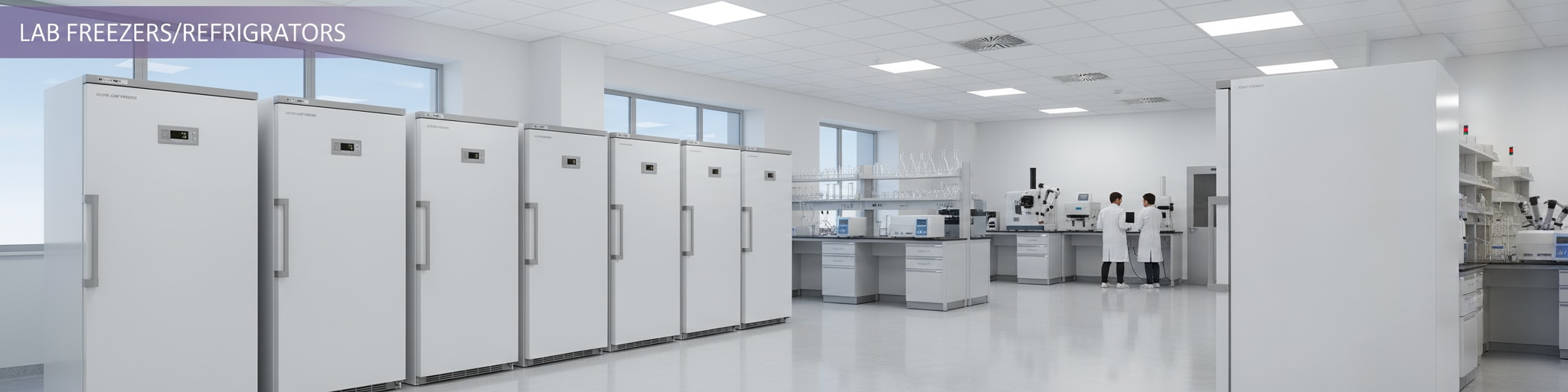 The image created shows lab freezers and refrigerators placed side by side in a clean laboratory environment. The equipment appears modern and is arranged neatly, emphasizing their role as essential storage units for scientific samples and materials that require precise temperature control. The setting suggests a professional lab focused on maintaining the integrity of biological or chemical substances through proper refrigeration and freezing.