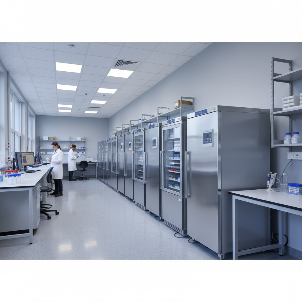 The image depicts modern lab freezers and refrigerators positioned side by side within a laboratory environment. The sleek and clean design highlights advanced scientific storage equipment used to preserve temperature-sensitive samples and materials. The overall setting emphasizes a controlled and organized workspace essential for laboratory research and experimentation.