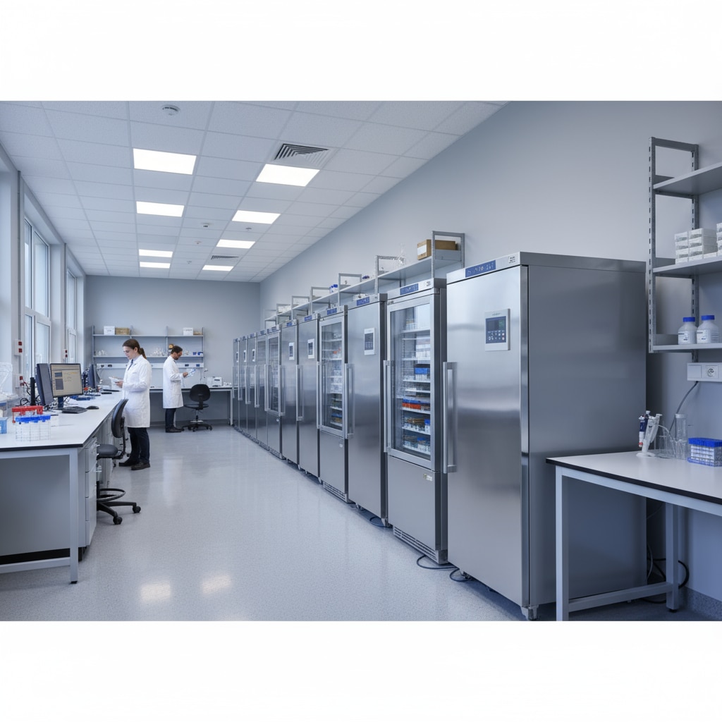 The image shows lab freezers and refrigerators neatly arranged side by side in a modern research lab. The environment is clean, organized, and designed to support scientific work, emphasizing the importance of proper storage for temperature-sensitive materials. The equipment's modern appearance reflects advanced technology used to ensure the safety and integrity of samples and reagents.Here is a description of the images created for lab freezers and refrigerators: The images show modern laboratory freezers and refrigerators arranged side by side in a clean and organized laboratory setting. These pieces of equipment are designed for precise temperature control, essential for preserving sensitive biological or chemical samples in scientific research. The environments depicted highlight professionalism and the critical role of reliable refrigeration in maintaining sample integrity. If any further details or specific types of lab refrigerators or freezers are needed, please let me know!