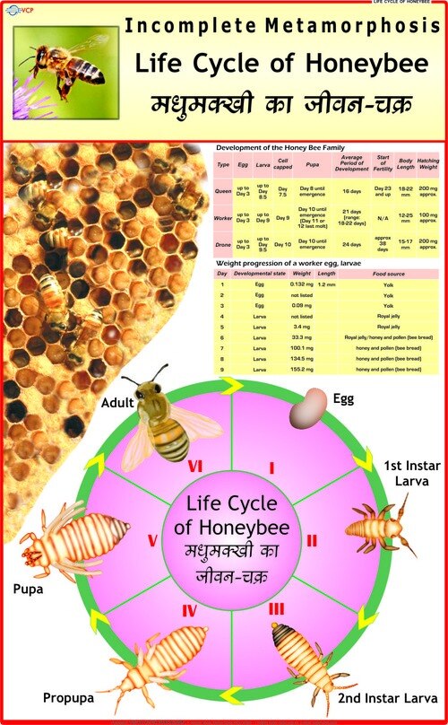 The “Life Cycle of Honey Bee” (55×90 cm) educational chart illustrates the four sequential stages of honey bee development (egg, larva, pupa, adult), including caste differences and biological notes on life span and roles, making it ideal for biology classrooms.​ Chart Features and Life Cycle Stages Size and Material: Measures 55×90 cm, printed in multicolor, and typically laminated for classroom durability.​ Life Stages: Egg Stage: The queen bee lays each egg in a wax cell; eggs stay upright and then fall over by the third day. Fertilized eggs become females (workers or queens); unfertilized eggs become males (drones).​ Larva Stage: Eggs hatch into larvae after 3 days. All larvae are first fed royal jelly, after which queen larvae continue on royal jelly and workers/drones switch to pollen and nectar. Larvae molt several times as they grow for 5–6 days.​ Pupa Stage: After larval feeding, the cell is sealed. Pupae develop body features: legs, wings, eyes, and hair. This stage lasts 7–14 days, depending on caste.​ Adult Stage: The mature bee chews its way out of the wax cap. Development time: queen emerges in 16 days, worker in 18–22 days, drone in about 24 days. Adults assume hive roles (queen, worker, or drone) and perform tasks like foraging, hive maintenance, or mating.​ Educational Notes: The chart may include a table or arrows indicating time for each caste (drone, queen, worker), feeding differences, and castes' hive responsibilities.​ Highlights pollination, honey/wax production, and social behaviors. Diagrams may show the circular progression and include vivid illustrations for each stage.​ This chart offers a visual summary of holometabolous insect development, honey bee biology, and the importance of bees in ecosystem and agriculture.​
