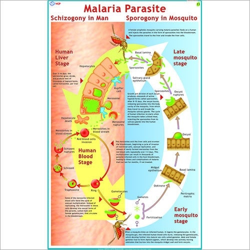 A “Life History of Malaria Parasite (Plasmodium)” (55×90 cm) educational chart visually details the complex lifecycle of the Plasmodium species that cause malaria, emphasizing the alternation of hosts and the stages leading to infection and disease.​ Key Features and Lifecycle Stages Size and Format: The chart measures 55×90 cm and is generally printed in full color, with clear, stepwise illustrations and labeled stages for classroom or laboratory use.​ Lifecycle Stages Illustrated: Mosquito Stage (Sexual Cycle): Begins when a female Anopheles mosquito bites an infected human, ingesting gametocytes (sexual forms of Plasmodium) present in the bloodstream.​ Gametocytes mate within the mosquito’s gut, forming a zygote that develops into an oocyst. The oocyst bursts, releasing sporozoites that migrate to the mosquito’s salivary glands.​ Transmission to Human (Asexual Cycle): During the mosquito’s next blood meal, sporozoites are injected into the human bloodstream.​ Sporozoites travel to the liver, infect hepatocytes, and multiply, forming liver-stage schizonts.​ Schizonts rupture, releasing merozoites into the bloodstream.​ Merozoites infect red blood cells, multiply, and cause cyclic cell bursting, leading to fever and other malaria symptoms.​ Some merozoites develop into gametocytes, which are picked up by a mosquito to continue the cycle.​ Educational Highlights: Chart diagrams show circular transmission arrows, with mosquito and human icons representing host switches. All major stages are labeled: gametocyte (sexual), sporozoite (infective), merozoite (asexual), schizont (multiplying), and pathogenic results for humans (fever, anemia). Some charts include brief notes on the clinical impact (malaria), vector specificity (Anopheles mosquitoes), and public health relevance.​ Utility: Supports biology and health science lessons, enabling students to understand the transmission, development, and global importance of malaria.​ This chart provides a comprehensive, visually accessible reference for the study of parasitology, infectious disease cycles, and the biology of malaria transmission.​
