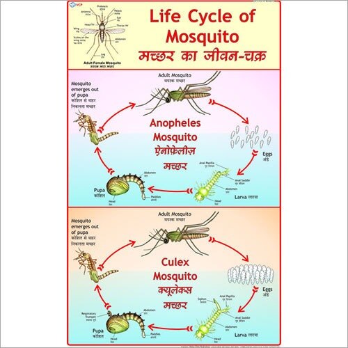A “Life History of Mosquito (Anopheles & Culex)” chart (55×90 cm) is a large, laminated educational wall chart depicting the complete life cycle—egg, larva, pupa, and adult—of two medically important mosquito genera, highlighting their differences and significance for public health, biology, and zoology curricula.​ Chart Features and Content Chart Size and Material: 55 × 90 cm, printed on 80 GSM map litho or synthetic paper, thermally laminated for tear and water resistance—formulated for long-term classroom and lab use.​ Life Cycle Depiction: Eggs: Anopheles lays single, boat-shaped eggs with lateral floats on clean water; Culex lays eggs in floating rafts on stagnant water. Larva: Illustrates wriggler stage—Anopheles larva lie parallel to water surface (no siphon), Culex hangs down (with siphon for breathing). Pupa: Shows comma-shaped, aquatic pupa (non-feeding, mobile, responsive to light). Adult: Anopheles adults rest at a 45° angle, while Culex are parallel to the surface. Key distinguishing features—palps, resting posture, wing patterns—often labeled for each genus.​ Annotations and Comparisons: Diagrams use arrows or circular design to represent progression; side panels or color highlights contrast Anopheles (malaria vector) with Culex (vector for filariasis, West Nile virus).​ Educational Details: Includes notes on habitat, reproductive habits, feeding behaviors (only females require blood meals), and life span—enabling direct curriculum and health science relevance.​ Institutional and Catalog Use Widely used for biology, medical entomology, vector control education, and exam prep—visualizing development, mosquito prevention, and vector ecology. Distributed by major Indian and international educational chart suppliers (Vidya Chitr Prakashan, Flipkart, online educational poster vendors), meeting procurement and catalog standards for schools, science fairs, and public health.​ For digital or print catalog inclusion, select high-resolution images with clear, standardized diagrams distinguishing Anopheles and Culex features at every stage.​