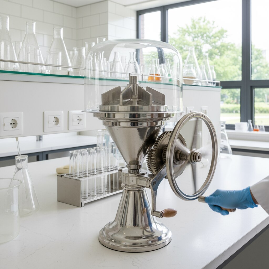 The image depicts a manual centrifuge machine in a clean laboratory setting. The device has a classic, hand-operated design typically used for spinning samples at high speeds without the use of electric power. It features a sturdy base and handles for manual operation, reflecting its functionality for small-scale or resource-limited laboratory environments.