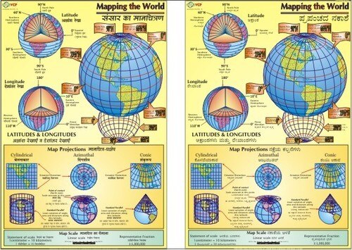 The “Mapping the World (Longitude, Latitude, Projections) (50x70cm)” chart is an educational poster illustrating key concepts in global mapping, specifically the use of latitude and longitude lines and basic map projections, designed for classroom or academic settings.​ Description Size: 50 × 70 cm.​ Material: Laminated on both sides for durability, with plastic rollers for easy hanging in classrooms or study centres.​ Content Features: Illustrates the latitude and longitude grid system (parallels and meridians), which allows locating any place on Earth using degrees, minutes, and seconds.​ Shows major reference lines such as the equator, prime meridian, Tropics of Cancer and Capricorn, Arctic and Antarctic Circles, and the International Date Line.​ Includes simplified depictions of common map projections—how the curved surface of the globe can be represented on a flat surface, with diagrams explaining cylindrical, conic, and planar projections.​ May provide brief notes or legends explaining how coordinate systems and projections are used for navigation and modern mapping.​ Designed with colorful, easy-to-read illustrations that support lessons for middle to secondary school geography.​ Educational Value Explains how the location of any place on Earth can be described using a coordinate grid system, laying the foundation for map reading and navigation skills.​ Introduces students to the challenge of map projection—how to represent a three-dimensional globe on a two-dimensional map, and the types of distortion each method produces.​ Serves as a core reference in basic geography education, especially for understanding globes, atlases, and geographic information systems (GIS).​ This chart is essential for teaching the fundamentals of world mapping, spatial literacy, and practical map use in both academic and everyday contexts.​