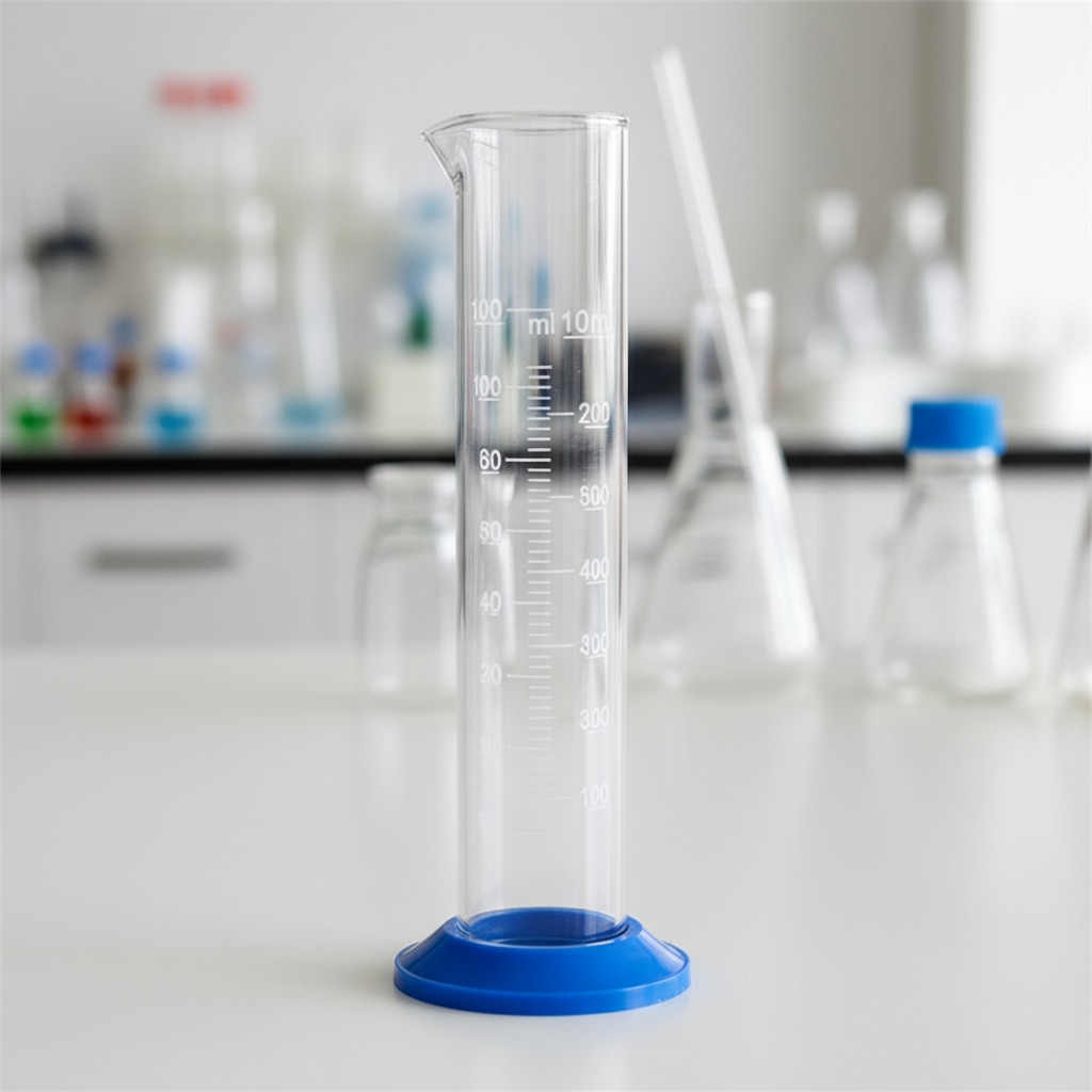 A Measuring Cylinder (Blue) with a plastic base and 1 liter capacity is a high-quality laboratory instrument made of durable borosilicate glass with blue enamel graduation marks for accurate volume measurement. It features a hexagonal plastic base for enhanced stability and prevention of tipping or rolling during use. The cylinder is calibrated to Class A or B standards, ensuring reliable and precise measurements. Key Features Made of borosilicate glass 3.3 with chemical-resistant blue graduations. Hexagonal plastic base designed to improve stability and reduce breakage. Drip-free pouring spout for clean and precise liquid transfer. Typical height around 420-470 mm, with a diameter near 65-70 mm. Calibrated to contain liquids at reference temperature of +20°C (IN calibration). Autoclavable without the plastic base for sterilization. Suitable for use in scientific, educational, and industrial laboratories. This measuring cylinder is essential for accurate volumetric liquid handling in various laboratory applications demanding precision and safety.