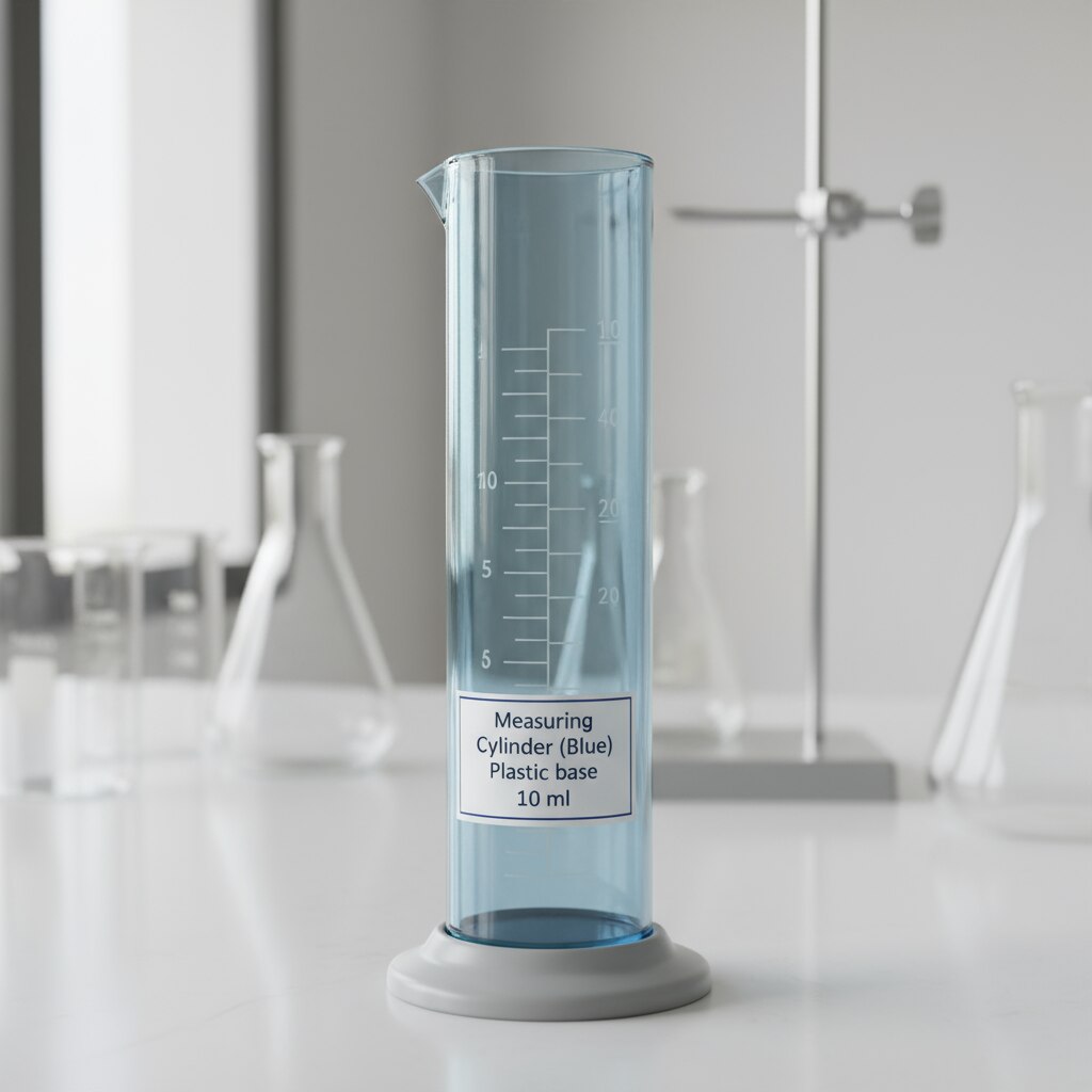 The image shows a blue measuring cylinder with a plastic base and a 10 ml capacity, clearly labeled for easy identification(see the generated image above). ### Description - This blue measuring cylinder is made with a durable plastic base to provide stability and prevent rolling. - The 10 ml capacity makes it ideal for small volume liquid measurements in laboratory and educational settings. - It features clear graduation marks for precise and accurate liquid measurement.