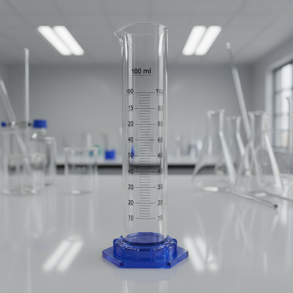 A Measuring Cylinder (Blue) with a plastic base and 100 ml capacity is a laboratory instrument made from high-quality borosilicate glass, featuring blue graduation marks for clear and precise readings. It includes a sturdy, detachable hexagonal plastic base that provides extra stability and impact resistance, minimizing the risk of tipping or breaking. The cylinder is Class A or B calibrated, ensuring accuracy with typical graduations of 1 ml and tolerance around ±0.5 ml. Key Features Manufactured from durable borosilicate glass 3.3 with chemical-resistant blue enamel graduations. Hexagonal plastic base designed for stability and impact absorption. Drip-free pouring spout for precise liquid transfer. Typical dimensions: approximately 240 mm tall and 30 mm diameter base. Suitable for scientific laboratories, educational institutions, and industrial use. Comes with a polypropylene stopper for sealing liquids. This measuring cylinder is well-suited for precise volumetric measurements requiring durability, ease of use, and safety in handling liquids.