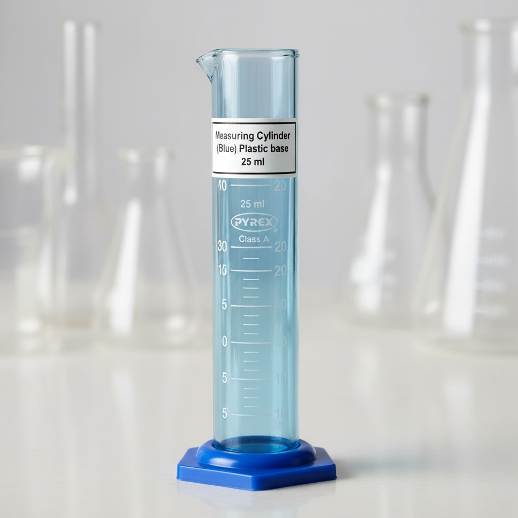 The image shows a blue measuring cylinder with a plastic base and a 25 ml capacity, clearly labeled for easy identification(see the generated image above). ### Description - This measuring cylinder features a vibrant blue color with a sturdy plastic base designed to prevent rolling and enhance stability. - Its 25 ml capacity is suitable for measuring small volumes of liquid with accuracy. - The cylinder is equipped with clear, easy-to-read graduations for precise measurements, making it ideal for laboratory experiments, educational use, or general liquid measuring tasks.